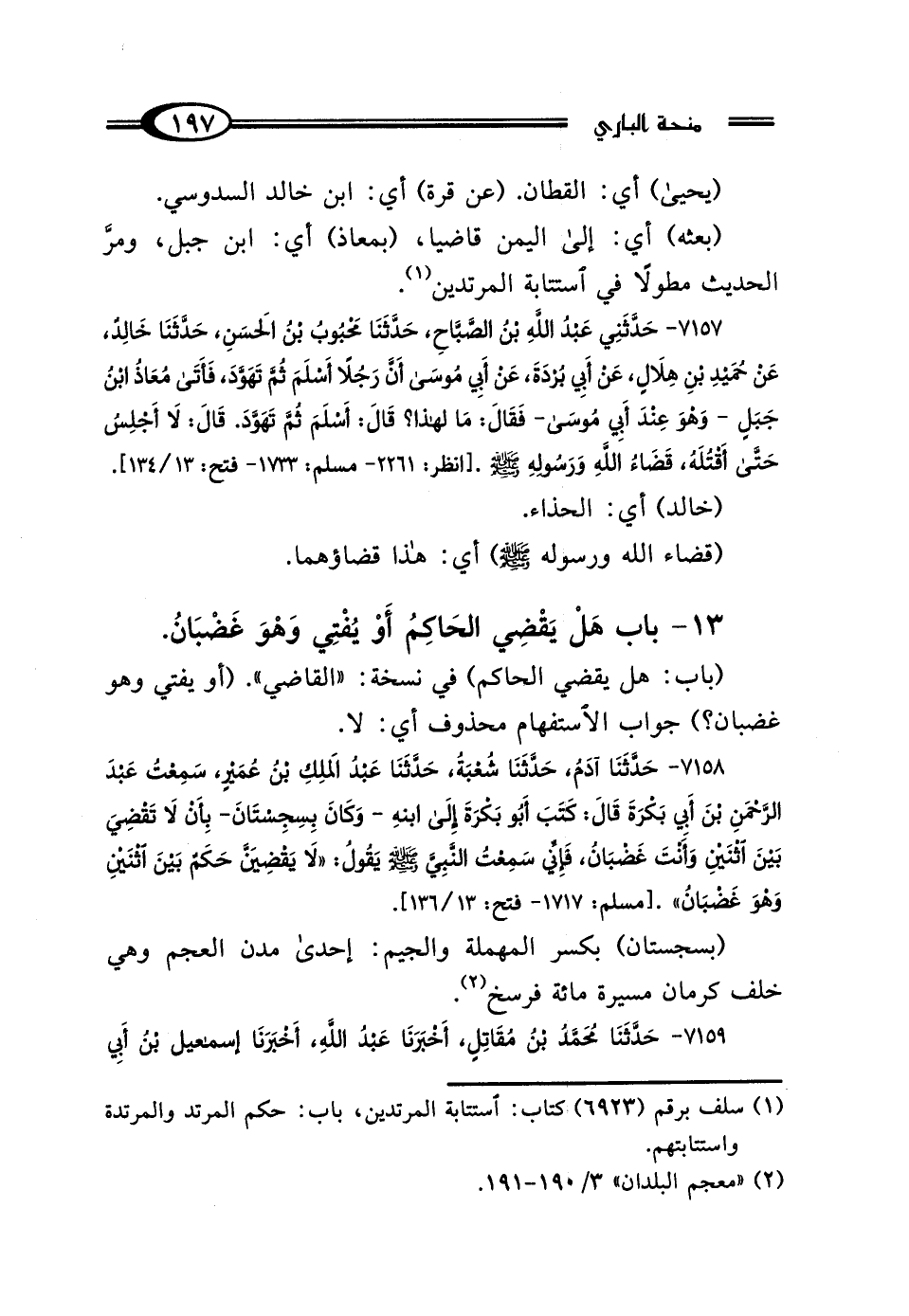 7157 - حَدَّثَنِي عَبْدُ اللَّهِ بْنُ الصَّبَّاحِ، حَدَّثَنَا مَحْبُوبُ بْنُ الحَسَنِ، حَدَّثَنَا خَالِدٌ، عَنْ حُمَيْدِ بْنِ هِلالٍ، عَنْ أَبِي بُرْدَةَ، عَنْ أَبِي مُوسَى: أَنَّ رَجُلًا أَسْلَمَ ثُمَّ تَهَوَّدَ، فَأَتَى مُعَاذُ بْنُ جَبَلٍ وَهُوَ عِنْدَ أَبِي مُوسَى فَقَال: مَا لِهَذَا؟ قَال: أَسْلَمَ ثُمَّ تَهَوَّدَ، قَال: "لَا أَجْلِسُ حَتَّى أَقْتُلَهُ، قَضَاءُ اللَّهِ وَرَسُولِهِ صَلَّى اللهُ عَلَيْهِ وَسَلَّمَ".