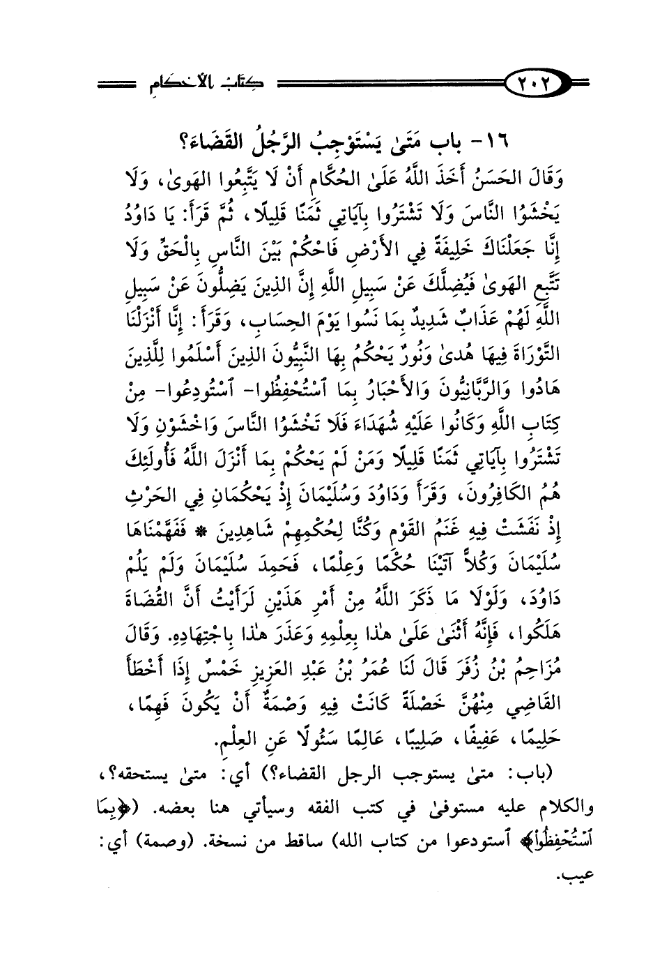 وَقَال الحَسَنُ: "أَخَذَ اللَّهُ عَلَى الحُكَّامِ أَنْ لَا يَتَّبِعُوا الهَوَى، وَلَا يَخْشَوُا النَّاسَ، وَلَا يَشْتَرُوا بِآيَاتِي ثَمَنًا قَلِيلًا، ثُمَّ قَرَأَ: {يَا دَاوُدُ إِنَّا جَعَلْنَاكَ خَلِيفَةً فِي الأَرْضِ، فَاحْكُمْ بَيْنَ النَّاسِ بِالحَقِّ، وَلَا تَتَّبِعِ الهَوَى فَيُضِلَّكَ عَنْ سَبِيلِ اللَّهِ، إِنَّ الَّذِينَ يَضِلُّونَ عَنْ سَبِيلِ اللَّهِ لَهُمْ عَذَابٌ شَدِيدٌ بِمَا نَسُوا يَوْمَ الحِسَابِ}، وَقَرَأَ: {إِنَّا أَنْزَلْنَا التَّوْرَاةَ فِيهَا هُدًى وَنُورٌ يَحْكُمُ بِهَا النَّبِيُّونَ الَّذِينَ أَسْلَمُوا لِلَّذِينَ هَادُوا وَالرَّبَّانِيُّونَ وَالأَحْبَارُ بِمَا اسْتُحْفِظُوا مِنْ كِتَابِ اللَّهِ، وَكَانُوا عَلَيْهِ شُهَدَاءَ، فَلَا تَخْشَوُا النَّاسَ وَاخْشَوْنِ، وَلَا تَشْتَرُوا بِآيَاتِي ثَمَنًا قَلِيلًا وَمَنْ لَمْ يَحْكُمْ بِمَا أَنْزَلَ اللَّهُ فَأُولَئِكَ هُمُ الكَافِرُونَ} [المائدة: 44]، " {بِمَا اسْتُحْفِظُوا} [المائدة: 44]: اسْتُوْدِعُوا مِنْ كِتَابِ اللَّهِ"، وَقَرَأَ: {وَدَاوُدَ، وَسُلَيْمَانَ إِذْ يَحْكُمَانِ فِي الحَرْثِ إِذْ نَفَشَتْ فِيهِ غَنَمُ القَوْمِ وَكُنَّا لِحُكْمِهِمْ شَاهِدِينَ، فَفَهَّمْنَاهَا سُلَيْمَانَ وَكُلًّا آتَيْنَا حُكْمًا وَعِلْمًا}، "فَحَمِدَ سُلَيْمَانَ وَلَمْ يَلُمْ دَاوُدَ، وَلَوْلا مَا ذَكَرَ اللَّهُ مِنْ أَمْرِ هَذَيْنِ لَرَأَيْتُ أَنَّ القُضَاةَ هَلَكُوا، فَإِنَّهُ أَثْنَى عَلَى هَذَا بِعِلْمِهِ وَعَذَرَ هَذَا بِاجْتِهَادِهِ" وَقَال مُزَاحِمُ بْنُ زُفَرَ: قَال لَنَا عُمَرُ بْنُ عَبْدِ العَزِيزِ: "خَمْسٌ إِذَا أَخْطَأَ القَاضِي مِنْهُنَّ خَصْلَةً، كَانَتْ فِيهِ وَصْمَةٌ: أَنْ يَكُونَ فَهِمًا، حَلِيمًا، عَفِيفًا، صَلِيبًا، عَالِمًا، سَئُولًا عَنِ العِلْمِ.