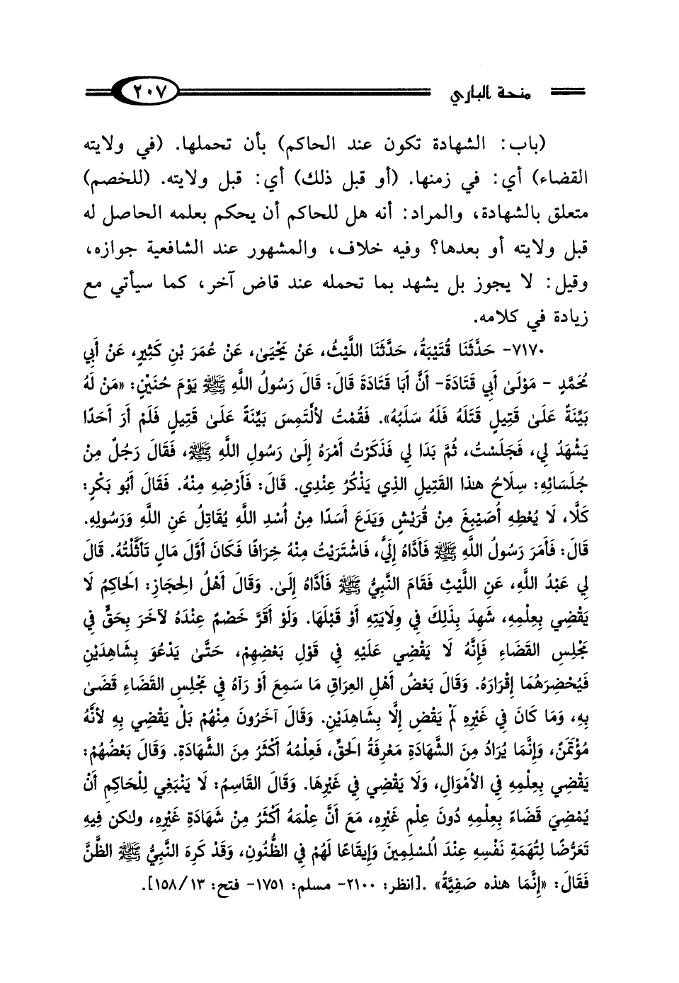 7170 - حَدَّثَنَا قُتَيْبَةُ، حَدَّثَنَا اللَّيْثُ بْنُ سَعْدٍ، عَنْ يَحْيَى، عَنْ عُمَرَ بْنِ كَثِيرٍ، عَنْ أَبِي مُحَمَّدٍ، مَوْلَى أَبِي قَتَادَةَ، أَنَّ أَبَا قَتَادَةَ، قَال: قَال رَسُولُ اللَّهِ صَلَّى اللهُ عَلَيْهِ وَسَلَّمَ، يَوْمَ حُنَيْنٍ: "مَنْ لَهُ بَيِّنَةٌ عَلَى قَتِيلٍ قَتَلَهُ فَلَهُ سَلَبُهُ"، فَقُمْتُ لِأَلْتَمِسَ بَيِّنَةً عَلَى قَتِيلِي، فَلَمْ أَرَ أَحَدًا يَشْهَدُ لِي، فَجَلَسْتُ، ثُمَّ بَدَا لِي، فَذَكَرْتُ أَمْرَهُ إِلَى رَسُولِ اللَّهِ صَلَّى اللهُ عَلَيْهِ وَسَلَّمَ، فَقَال رَجُلٌ مِنْ جُلَسَائِهِ: سِلاحُ هَذَا القَتِيلِ الَّذِي يَذْكُرُ عِنْدِي، قَال: فَأَرْضِهِ مِنْهُ، فَقَال أَبُو بَكْرٍ: كَلَّا، لَا يُعْطِيهِ أُصَيْبِغَ مِنْ قُرَيْشٍ وَيَدَعَ أَسَدًا مِنْ أُسْدِ اللَّهِ، يُقَاتِلُ عَنِ اللَّهِ وَرَسُولِهِ، قَال: فَأَمَرَ رَسُولُ اللَّهِ صَلَّى اللهُ عَلَيْهِ وَسَلَّمَ، فَأَدَّاهُ إِلَيَّ، فَاشْتَرَيْتُ مِنْهُ خِرَافًا، فَكَانَ أَوَّلَ مَالٍ تَأَثَّلْتُهُ، قَال لِي عَبْدُ اللَّهِ عَنِ اللَّيْثِ: فَقَامَ النَّبِيُّ صَلَّى اللهُ عَلَيْهِ وَسَلَّمَ فَأَدَّاهُ إِلَيَّ، " وَقَال أَهْلُ الحِجَازِ: الحَاكِمُ لَا يَقْضِي بِعِلْمِهِ شَهِدَ بِذَلِكَ فِي ولايَتِهِ أَوْ قَبْلَهَا، وَلَوْ أَقَرَّ خَصْمٌ عِنْدَهُ لِآخَرَ بِحَقٍّ فِي مَجْلِسِ القَضَاءِ، فَإِنَّهُ لَا يَقْضِي عَلَيْهِ فِي قَوْلِ بَعْضِهِمْ حَتَّى يَدْعُوَ بِشَاهِدَيْنِ فَيُحْضِرَهُمَا إِقْرَارَهُ "، " وَقَال بَعْضُ أَهْلِ العِرَاقِ: مَا سَمِعَ أَوْ رَآهُ فِي مَجْلِسِ القَضَاءِ قَضَى بِهِ، وَمَا كَانَ فِي غَيْرِهِ لَمْ يَقْضِ إلا بِشَاهِدَيْنِ "، " وَقَال آخَرُونَ مِنْهُمْ: بَلْ يَقْضِي بِهِ، لِأَنَّهُ مُؤْتَمَنٌ، وَإِنَّمَا يُرَادُ مِنَ الشَّهَادَةِ مَعْرِفَةُ الحَقِّ، فَعِلْمُهُ أَكْثَرُ مِنَ الشَّهَادَةِ، وَقَال بَعْضُهُمْ: يَقْضِي بِعِلْمِهِ فِي الأَمْوَالِ، وَلَا يَقْضِي فِي غَيْرِهَا"، وَقَال القَاسِمُ: "لَا يَنْبَغِي لِلْحَاكِمِ أَنْ يُمْضِيَ قَضَاءً بِعِلْمِهِ دُونَ عِلْمِ غَيْرِهِ، مَعَ أَنَّ عِلْمَهُ أَكْثَرُ مِنْ شَهَادَةِ غَيْرِهِ، وَلَكِنَّ فِيهِ تَعَرُّضًا لِتُهَمَةِ نَفْسِهِ عِنْدَ المُسْلِمِينَ، وَإِيقَاعًا لَهُمْ فِي الظُّنُونِ" وَقَدْ كَرِهَ النَّبِيُّ صَلَّى اللهُ عَلَيْهِ وَسَلَّمَ الظَّنَّ فَقَال: "إِنَّمَا هَذِهِ صَفِيَّةُ".