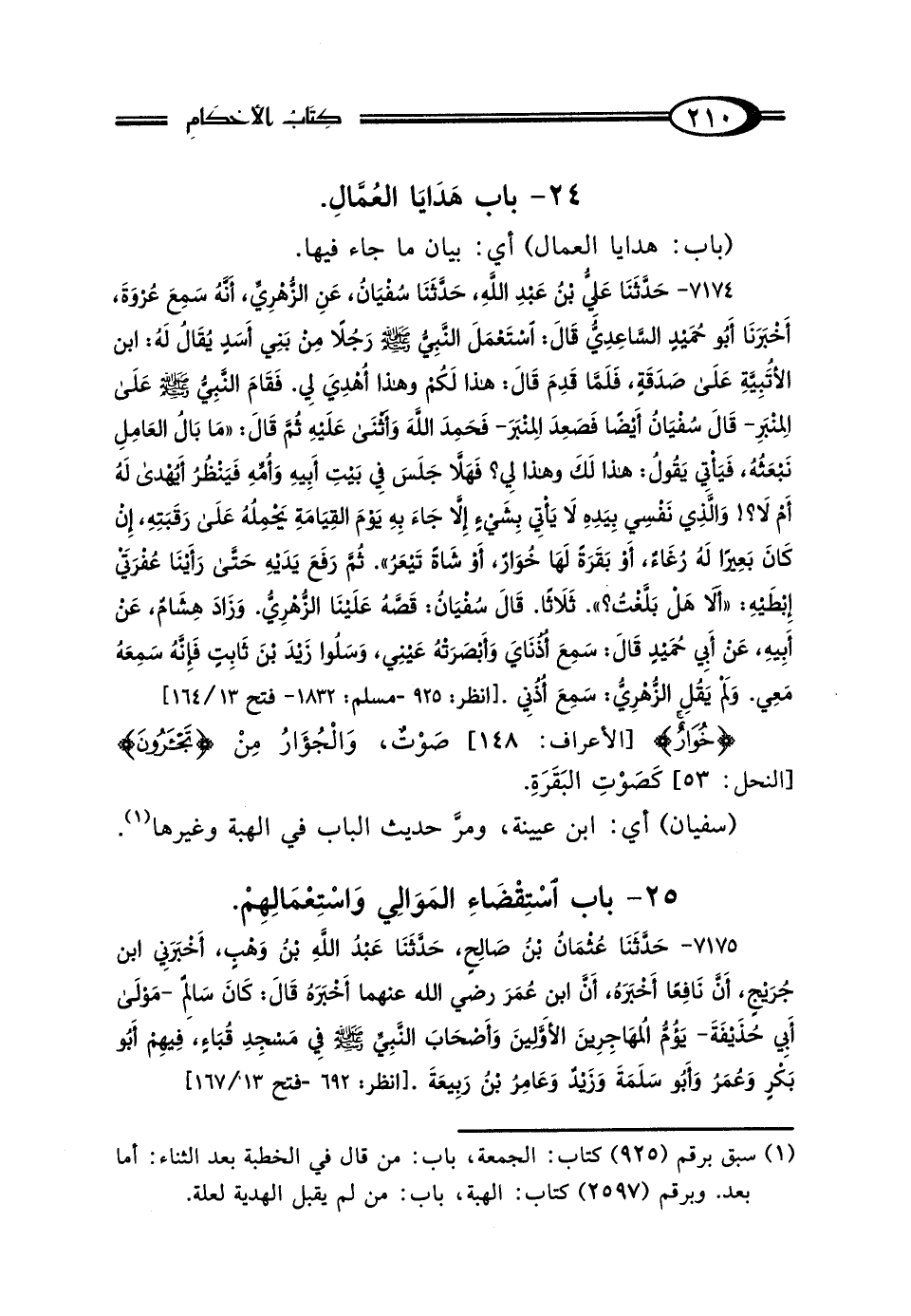 7174 - حَدَّثَنَا عَلِيُّ بْنُ عَبْدِ اللَّهِ، حَدَّثَنَا سُفْيَانُ، عَنِ الزُّهْرِيِّ، أَنَّهُ سَمِعَ عُرْوَةَ، أَخْبَرَنَا أَبُو حُمَيْدٍ السَّاعِدِيُّ، قَال: اسْتَعْمَلَ النَّبِيُّ صَلَّى اللهُ عَلَيْهِ وَسَلَّمَ رَجُلًا مِنْ بَنِي أَسْدٍ يُقَالُ لَهُ ابْنُ الأُتَبِيَّةِ عَلَى صَدَقَةٍ، فَلَمَّا قَدِمَ قَال: هَذَا لَكُمْ وَهَذَا أُهْدِيَ لِي، فَقَامَ النَّبِيُّ صَلَّى اللهُ عَلَيْهِ وَسَلَّمَ عَلَى المِنْبَرِ - قَال سُفْيَانُ أَيْضًا فَصَعِدَ المِنْبَرَ - فَحَمِدَ اللَّهَ وَأَثْنَى عَلَيْهِ ثُمَّ قَال: "مَا بَالُ العَامِلِ نَبْعَثُهُ فَيَأْتِي يَقُولُ: هَذَا لَكَ وَهَذَا لِي، فَهَلَّا جَلَسَ فِي بَيْتِ أَبِيهِ وَأُمِّهِ، فَيَنْظُرُ أَيُهْدَى لَهُ أَمْ لا، وَالَّذِي نَفْسِي بِيَدِهِ، لا يَأْتِي بِشَيْءٍ إلا جَاءَ بِهِ يَوْمَ القِيَامَةِ يَحْمِلُهُ عَلَى رَقَبَتِهِ، إِنْ كَانَ بَعِيرًا لَهُ رُغَاءٌ، أَوْ بَقَرَةً لَهَا خُوَارٌ، أَوْ شَاةً تَيْعَرُ"، ثُمَّ رَفَعَ يَدَيْهِ حَتَّى رَأَيْنَا عُفْرَتَيْ إِبْطَيْهِ" أَلا هَلْ بَلَّغْتُ " ثَلاثًا، قَال سُفْيَانُ: قَصَّهُ عَلَيْنَا الزُّهْرِيُّ، وَزَادَ هِشَامٌ، عَنْ أَبِيهِ، عَنْ أَبِي حُمَيْدٍ قَال: سَمِعَ أُذُنَايَ، وَأَبْصَرَتْهُ عَيْنِي، وَسَلُوا زَيْدَ بْنَ ثَابِتٍ فَإِنَّهُ سَمِعَهُ مَعِي، وَلَمْ يَقُلِ الزُّهْرِيُّ سَمِعَ أُذُنِي.