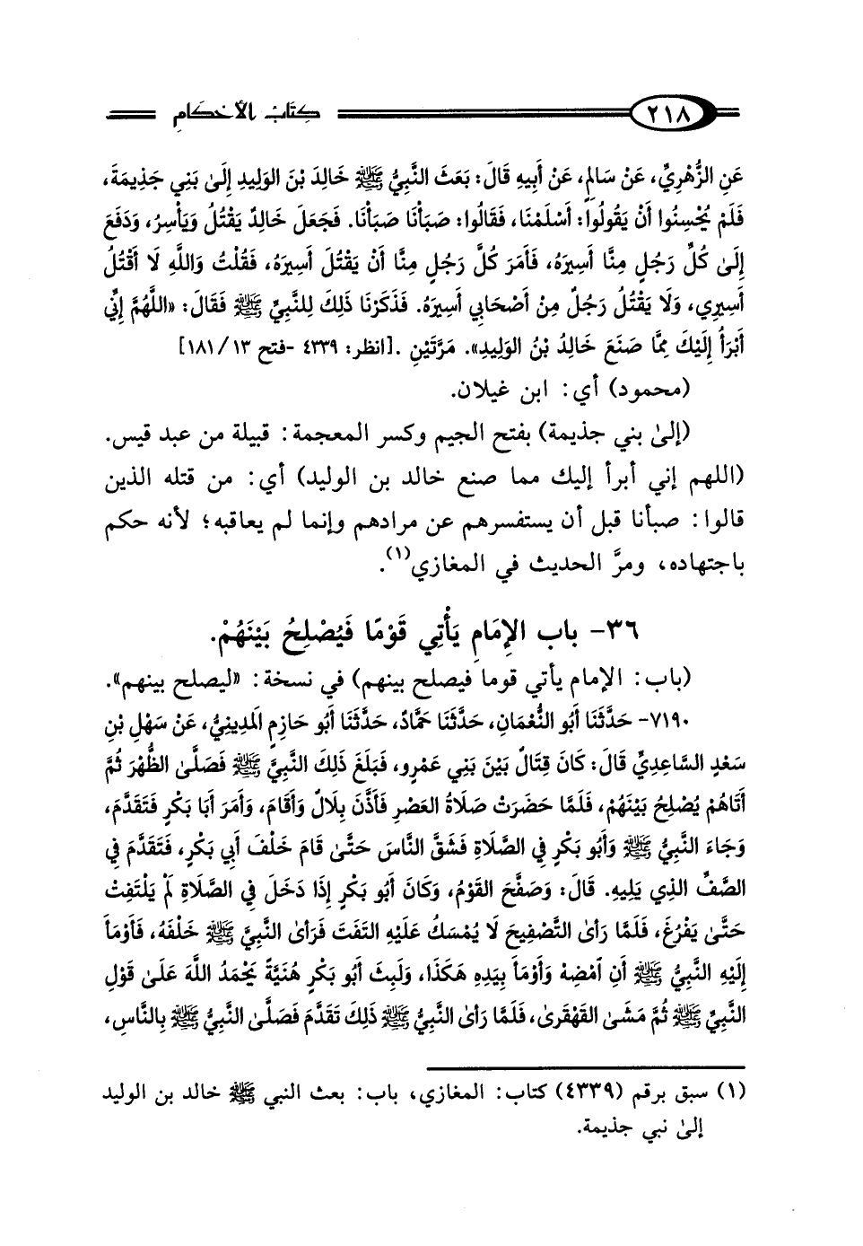 عَنِ الزُّهْرِيِّ، عَنْ سَالِمٍ، عَنْ أَبِيهِ، قَال: بَعَثَ النَّبِيُّ صَلَّى اللهُ عَلَيْهِ وَسَلَّمَ خَالِدَ بْنَ الوَلِيدِ إِلَى بَنِي جَذِيمَةَ، فَلَمْ يُحْسِنُوا أَنْ يَقُولُوا أَسْلَمْنَا، فَقَالُوا: صَبَأْنَا صَبَأْنَا، فَجَعَلَ خَالِدٌ يَقْتُلُ وَيَأْسِرُ، وَدَفَعَ إِلَى كُلِّ رَجُلٍ مِنَّا أَسِيرَهُ، فَأَمَرَ كُلَّ رَجُلٍ مِنَّا أَنْ يَقْتُلَ أَسِيرَهُ، فَقُلْتُ: وَاللَّهِ لَا أَقْتُلُ أَسِيرِي، وَلَا يَقْتُلُ رَجُلٌ مِنْ أَصْحَابِي أَسِيرَهُ، فَذَكَرْنَا ذَلِكَ لِلنَّبِيِّ صَلَّى اللهُ عَلَيْهِ وَسَلَّمَ فَقَال: "اللَّهُمَّ إِنِّي أَبْرَأُ إِلَيْكَ مِمَّا صَنَعَ خَالِدُ بْنُ الوَلِيدِ" مَرَّتَيْنِ.