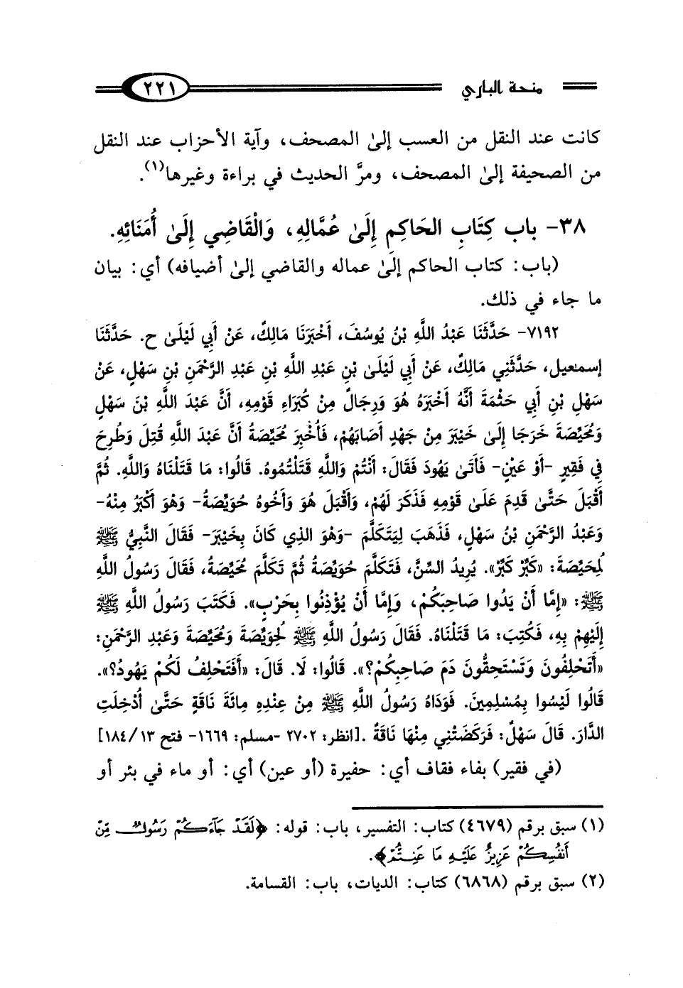 7192 - حَدَّثَنَا عَبْدُ اللَّهِ بْنُ يُوسُفَ، أَخْبَرَنَا مَالِكٌ، عَنْ أَبِي لَيْلَى، ح حَدَّثَنَا إِسْمَاعِيلُ، حَدَّثَنِي مَالِكٌ، عَنْ أَبِي لَيْلَى بْنِ عَبْدِ اللَّهِ بْنِ عَبْدِ الرَّحْمَنِ بْنِ سَهْلٍ، عَنْ سَهْلِ بْنِ أَبِي حَثْمَةَ أَنَّهُ أَخْبَرَهُ هُوَ وَرِجَالٌ مِنْ كُبَرَاءِ قَوْمِهِ: أَنَّ عَبْدَ اللَّهِ بْنَ سَهْلٍ وَمُحَيِّصَةَ خَرَجَا إِلَى خَيْبَرَ، مِنْ جَهْدٍ أَصَابَهُمْ، فَأُخْبِرَ مُحَيِّصَةُ أَنَّ عَبْدَ اللَّهِ قُتِلَ وَطُرِحَ فِي فَقِيرٍ أَوْ عَيْنٍ، فَأَتَى يَهُودَ فَقَال: أَنْتُمْ وَاللَّهِ قَتَلْتُمُوهُ، قَالُوا: مَا قَتَلْنَاهُ وَاللَّهِ، ثُمَّ أَقْبَلَ حَتَّى قَدِمَ عَلَى قَوْمِهِ، فَذَكَرَ لَهُمْ، وَأَقْبَلَ هُوَ وَأَخُوهُ حُوَيِّصَةُ - وَهُوَ أَكْبَرُ مِنْهُ - وَعَبْدُ الرَّحْمَنِ بْنُ سَهْلٍ، فَذَهَبَ لِيَتَكَلَّمَ وَهُوَ الَّذِي كَانَ بِخَيْبَرَ، فَقَال النَّبِيُّ صَلَّى اللهُ عَلَيْهِ وَسَلَّمَ لِمُحَيِّصَةَ: "كَبِّرْ كَبِّرْ" يُرِيدُ السِّنَّ، فَتَكَلَّمَ حُوَيِّصَةُ، ثُمَّ تَكَلَّمَ مُحَيِّصَةُ، فَقَال رَسُولُ اللَّهِ صَلَّى اللهُ عَلَيْهِ وَسَلَّمَ: "إِمَّا أَنْ يَدُوا صَاحِبَكُمْ، وَإِمَّا أَنْ يُؤْذِنُوا بِحَرْبٍ"، فَكَتَبَ رَسُولُ اللَّهِ صَلَّى اللهُ عَلَيْهِ وَسَلَّمَ إِلَيْهِمْ بِهِ، فَكُتِبَ مَا قَتَلْنَاهُ، فَقَال رَسُولُ اللَّهِ صَلَّى اللهُ عَلَيْهِ وَسَلَّمَ لِحُوَيِّصَةَ وَمُحَيِّصَةَ وَعَبْدِ الرَّحْمَنِ: "أَتَحْلِفُونَ، وَتَسْتَحِقُّونَ دَمَ صَاحِبِكُمْ؟ "، قَالُوا: لَا، قَال: "أَفَتَحْلِفُ لَكُمْ يَهُودُ؟ "، قَالُوا: لَيْسُوا بِمُسْلِمِينَ، فَوَدَاهُ رَسُولُ اللَّهِ صَلَّى اللهُ عَلَيْهِ وَسَلَّمَ مِنْ عِنْدِهِ مِائَةَ نَاقَةٍ حَتَّى أُدْخِلَتِ الدَّارَ، قَال سَهْلٌ: فَرَكَضَتْنِي مِنْهَا نَاقَةٌ.