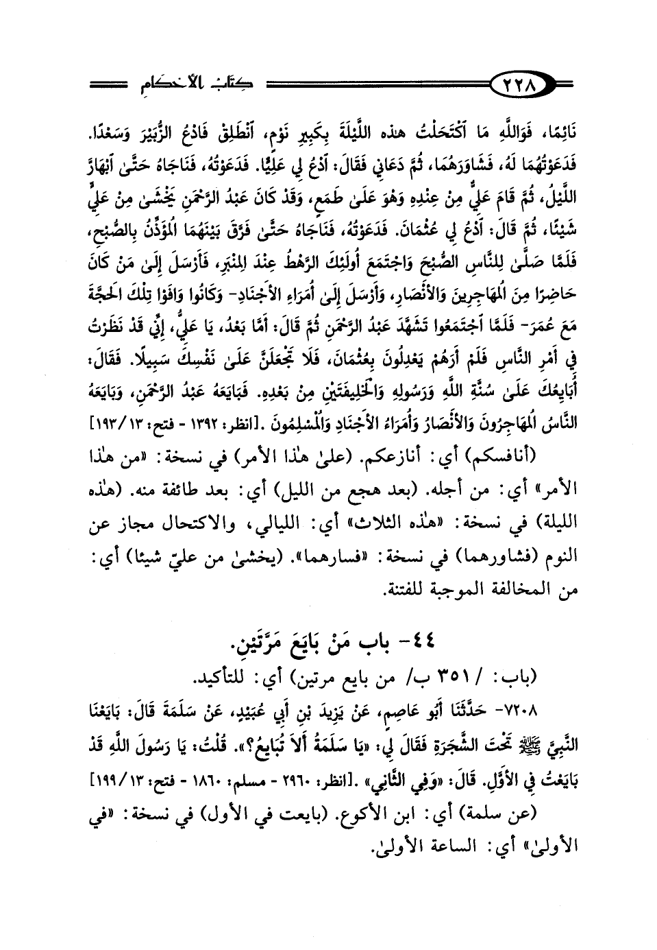 7208 - حَدَّثَنَا أَبُو عَاصِمٍ، عَنْ يَزِيدَ بْنِ أَبِي عُبَيْدٍ، عَنْ سَلَمَةَ، قَال: بَايَعْنَا النَّبِيَّ صَلَّى اللهُ عَلَيْهِ وَسَلَّمَ تَحْتَ الشَّجَرَةِ، فَقَال لِي: "يَا سَلَمَةُ أَلا تُبَايِعُ؟ "، قُلْتُ: يَا رَسُولَ اللَّهِ، قَدْ بَايَعْتُ فِي الأَوَّلِ، قَال: "وَفِي الثَّانِي".