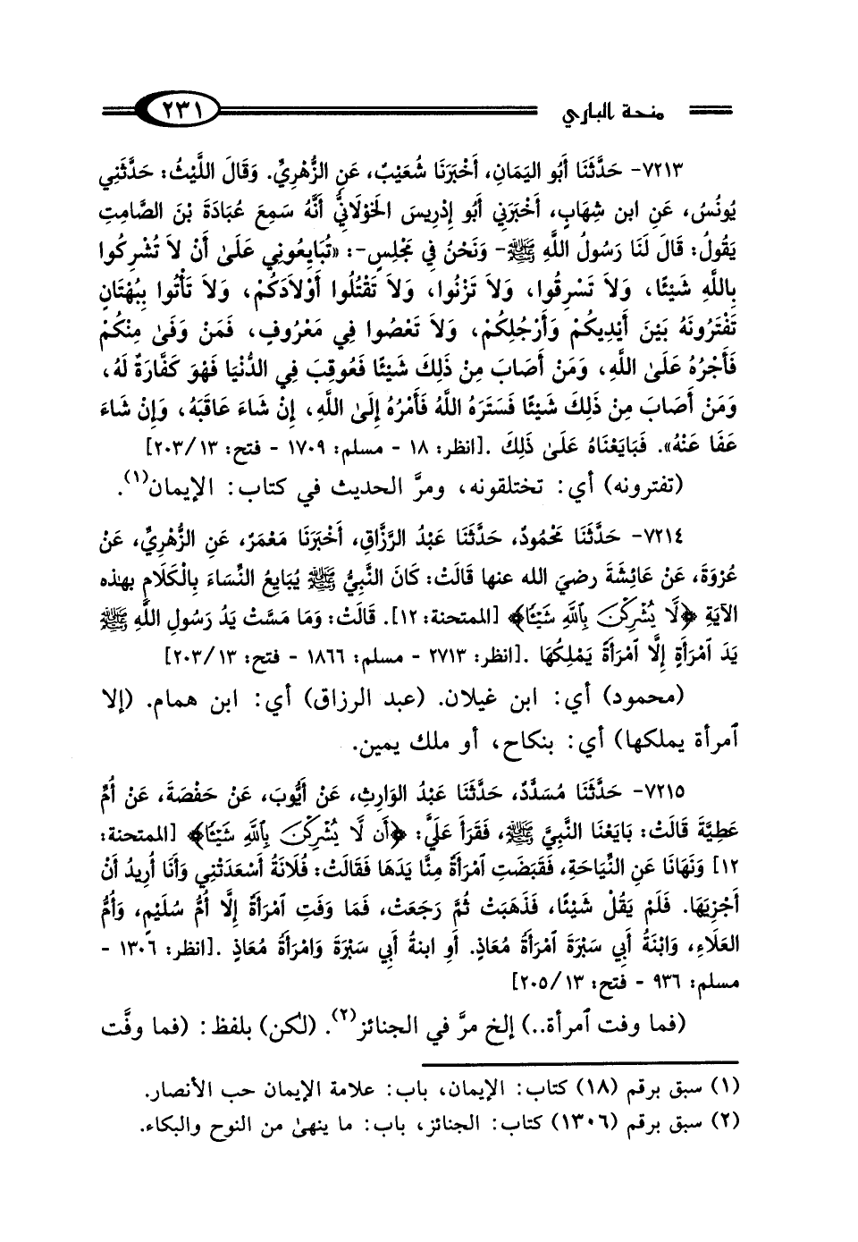 7213 - حَدَّثَنَا أَبُو اليَمَانِ، أَخْبَرَنَا شُعَيْبٌ، عَنِ الزُّهْرِيِّ، ح وَقَال اللَّيْثُ: حَدَّثَنِي يُونُسُ، عَنِ ابْنِ شِهَابٍ، أَخْبَرَنِي أَبُو إِدْرِيسَ الخَوْلانِيُّ، أَنَّهُ سَمِعَ عُبَادَةَ بْنَ الصَّامِتِ، يَقُولُ: قَال لَنَا رَسُولُ اللَّهِ صَلَّى اللهُ عَلَيْهِ وَسَلَّمَ وَنَحْنُ فِي مَجْلِسٍ: "تُبَايِعُونِي عَلَى أَنْ لَا تُشْرِكُوا بِاللَّهِ شَيْئًا، وَلَا تَسْرِقُوا، وَلَا تَزْنُوا، وَلَا تَقْتُلُوا أَوْلادَكُمْ، وَلَا تَأْتُوا بِبُهْتَانٍ تَفْتَرُونَهُ بَيْنَ أَيْدِيكُمْ وَأَرْجُلِكُمْ، وَلَا تَعْصُوا فِي مَعْرُوفٍ، فَمَنْ وَفَى مِنْكُمْ فَأَجْرُهُ عَلَى اللَّهِ، وَمَنْ أَصَابَ مِنْ ذَلِكَ شَيْئًا فَعُوقِبَ فِي الدُّنْيَا فَهُوَ كَفَّارَةٌ لَهُ، وَمَنْ أَصَابَ مِنْ ذَلِكَ شَيْئًا فَسَتَرَهُ اللَّهُ فَأَمْرُهُ إِلَى اللَّهِ، إِنْ شَاءَ عَاقَبَهُ، وَإِنْ شَاءَ عَفَا عَنْهُ"، فَبَايَعْنَاهُ عَلَى ذَلِكَ.