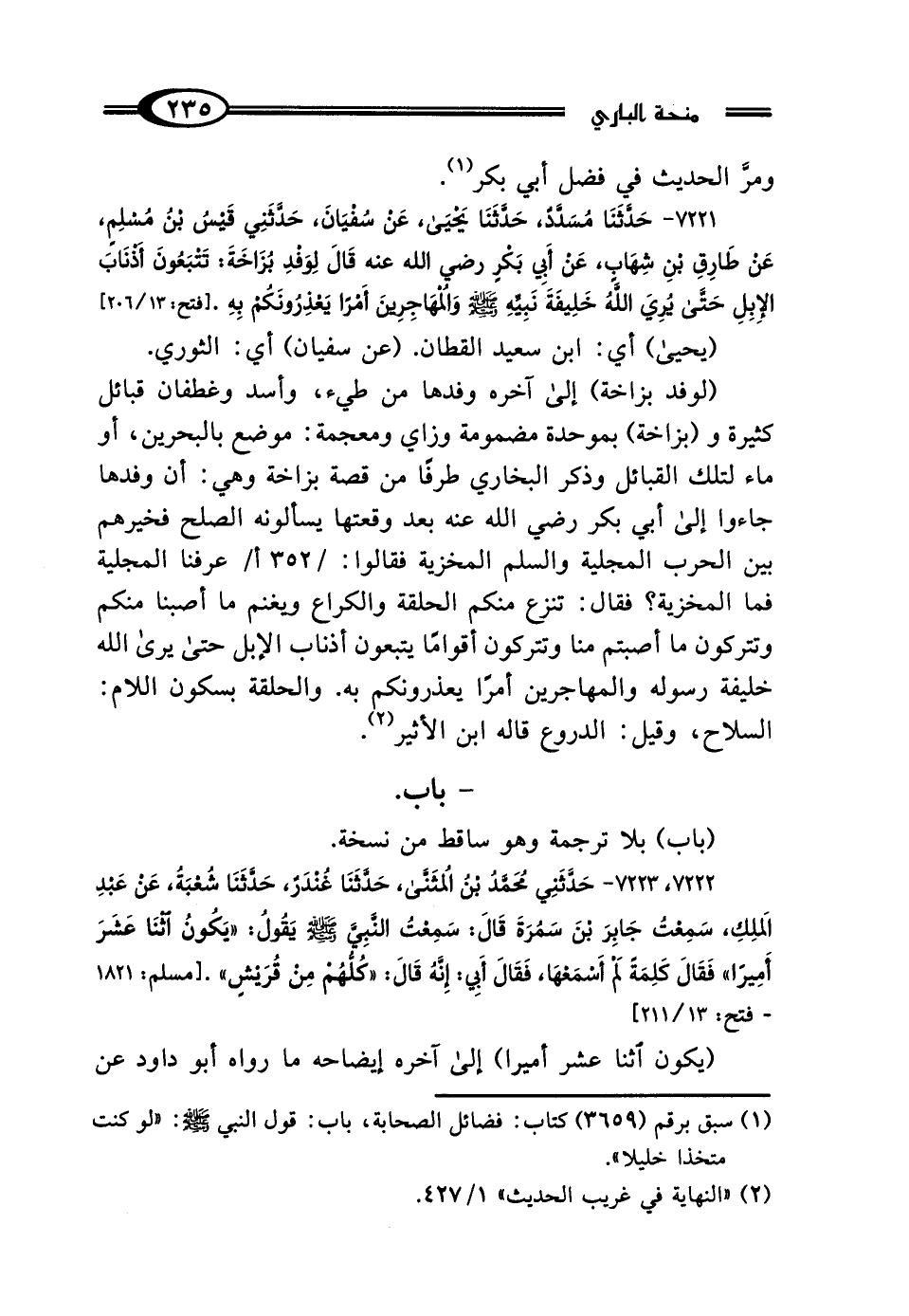 7221 - حَدَّثَنَا مُسَدَّدٌ، حَدَّثَنَا يَحْيَى، عَنْ سُفْيَانَ، حَدَّثَنِي قَيْسُ بْنُ مُسْلِمٍ، عَنْ طَارِقِ بْنِ شِهَابٍ، عَنْ أَبِي بَكْرٍ رَضِيَ اللَّهُ عَنْهُ، قَال: "لِوَفْدِ بُزَاخَةَ: تَتْبَعُونَ أَذْنَابَ الإِبِلِ، حَتَّى يُرِيَ اللَّهُ خَلِيفَةَ نَبِيِّهِ صَلَّى اللهُ عَلَيْهِ وَسَلَّمَ وَالمُهَاجِرِينَ أَمْرًا يَعْذِرُونَكُمْ بِهِ.