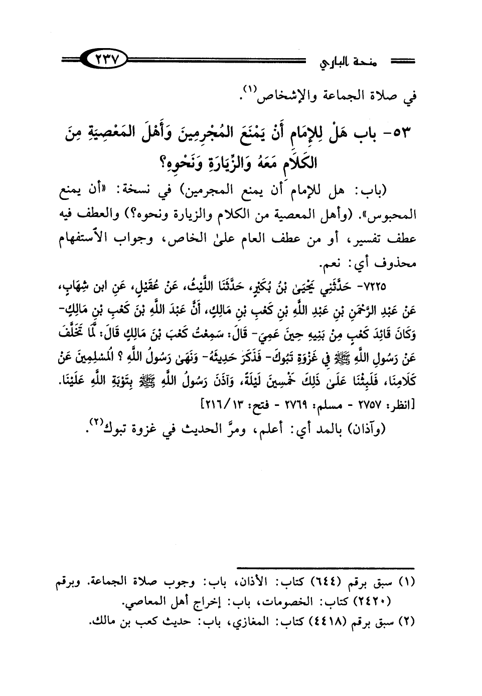 53 - بَابٌ: هَلْ لِلْإِمَامِ أَنْ يَمْنَعَ المُجْرِمِينَ وَأَهْلَ المَعْصِيَةِ مِنَ الكَلامِ مَعَهُ وَالزِّيَارَةِ وَنَحْوهِ؟