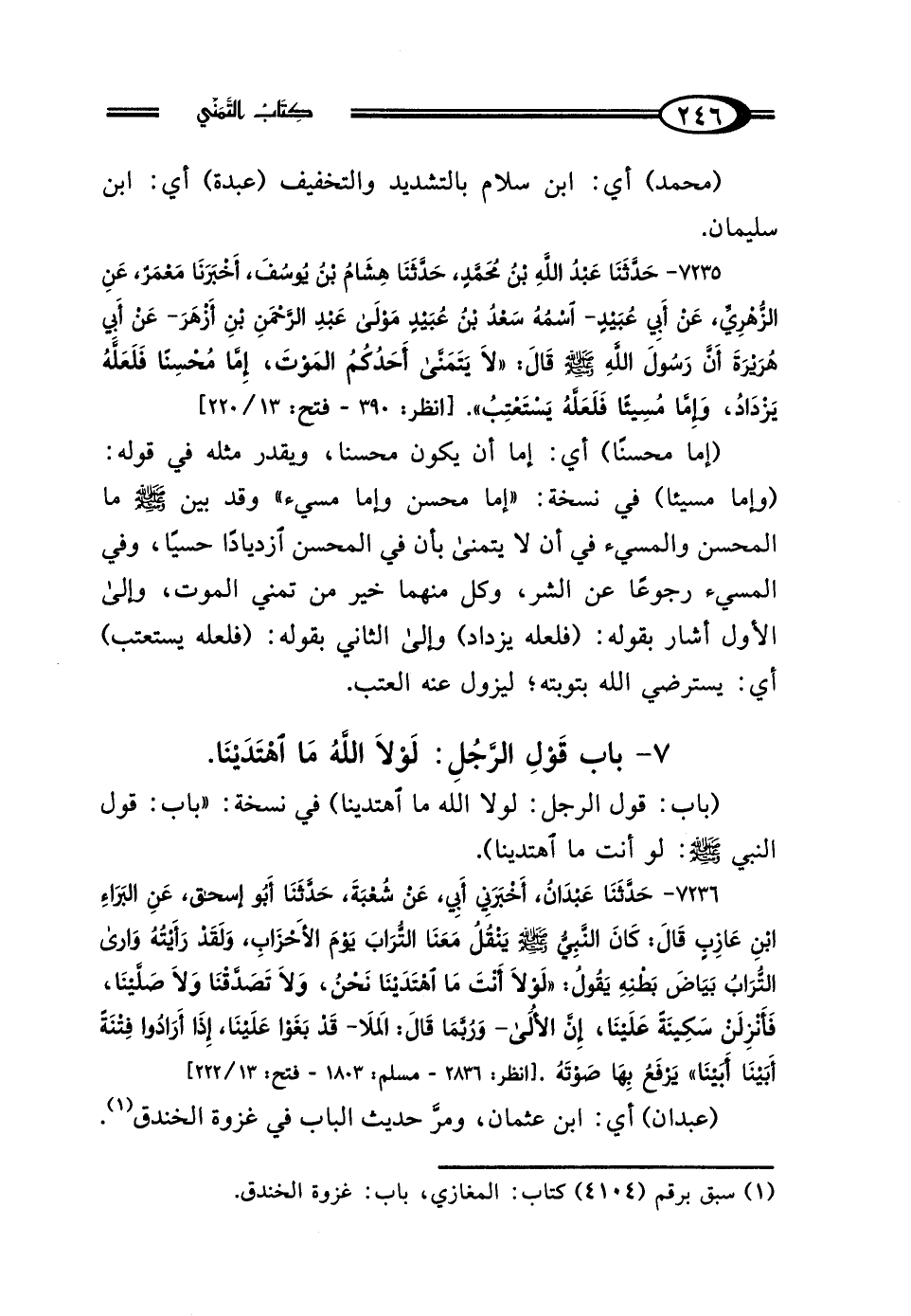 7235 - حَدَّثَنَا عَبْدُ اللَّهِ بْنُ مُحَمَّدٍ، حَدَّثَنَا هِشَامُ بْنُ يُوسُفَ، أَخْبَرَنَا مَعْمَرٌ، عَنِ الزُّهْرِيِّ، عَنْ أَبِي عُبَيْدٍ اسْمُهُ سَعْدُ بْنُ عُبَيْدٍ، مَوْلَى عَبْدِ الرَّحْمَنِ بْنِ أَزْهَرَ عَنْ أَبِي هُرَيْرَةَ أَنَّ رَسُولَ اللَّهِ صَلَّى اللهُ عَلَيْهِ وَسَلَّمَ، قَال: "لَا يَتَمَنَّى أَحَدُكُمُ المَوْتَ إِمَّا مُحْسِنًا فَلَعَلَّهُ يَزْدَادُ، وَإِمَّا مُسِيئًا فَلَعَلَّهُ يَسْتَعْتِبُ".