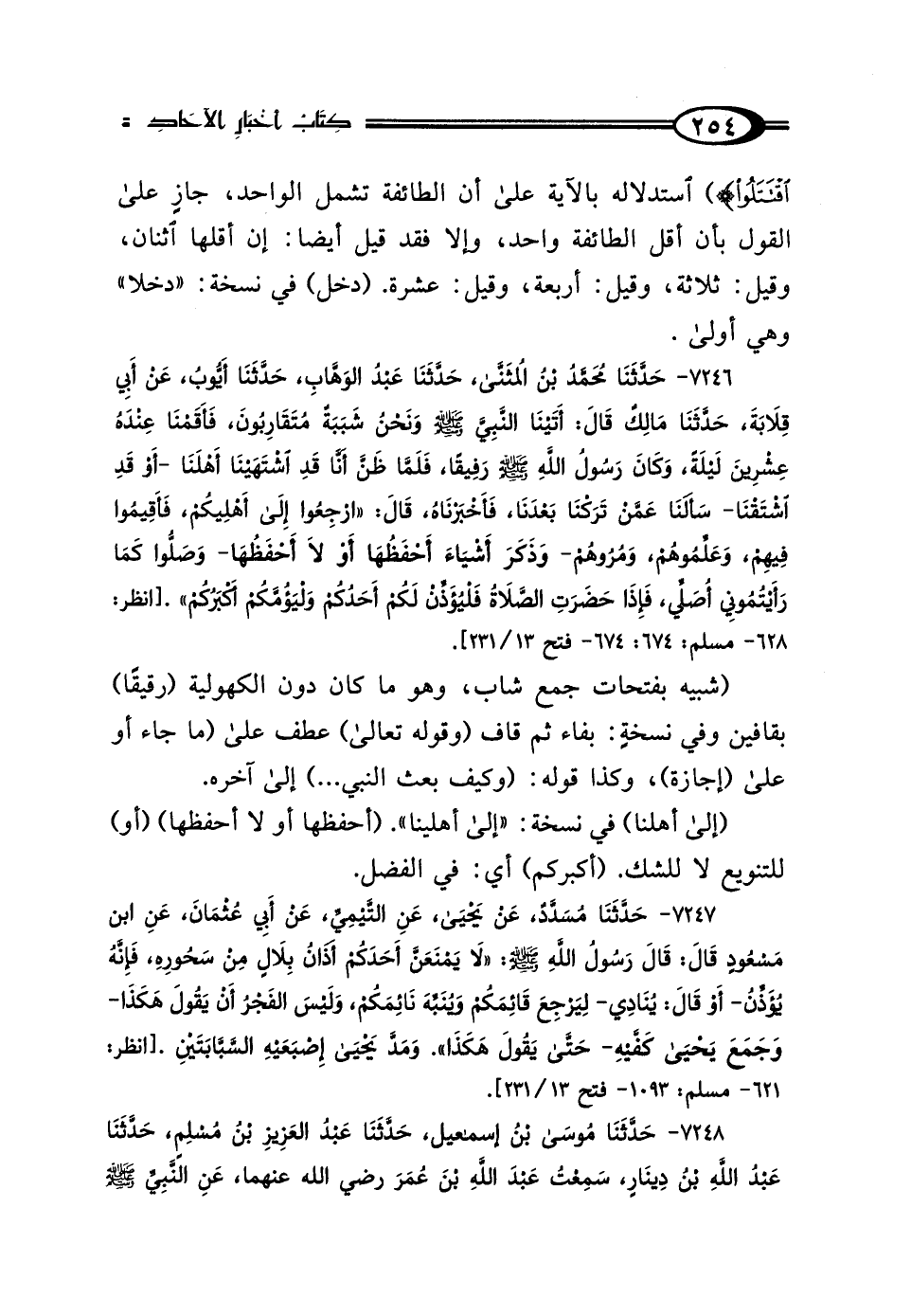 7246 - حَدَّثَنَا مُحَمَّدُ بْنُ المُثَنَّى، حَدَّثَنَا عَبْدُ الوَهَّابِ، حَدَّثَنَا أَيُّوبُ، عَنْ أَبِي قِلابَةَ، حَدَّثَنَا مَالِكُ بْنُ الحُوَيْرِثِ، قَال: أَتَيْنَا النَّبِيَّ صَلَّى اللهُ عَلَيْهِ وَسَلَّمَ وَنَحْنُ شَبَبَةٌ مُتَقَارِبُونَ، فَأَقَمْنَا عِنْدَهُ عِشْرِينَ لَيْلَةً، وَكَانَ رَسُولُ اللَّهِ صَلَّى اللهُ عَلَيْهِ وَسَلَّمَ رَفِيقًا، فَلَمَّا ظَنَّ أَنَّا قَدِ اشْتَهَيْنَا أَهْلَنَا - أَوْ قَدِ اشْتَقْنَا - سَأَلَنَا عَمَّنْ تَرَكْنَا بَعْدَنَا فَأَخْبَرْنَاهُ، قَال: "ارْجِعُوا إِلَى أَهْلِيكُمْ، فَأَقِيمُوا فِيهِمْ، وَعَلِّمُوهُمْ وَمُرُوهُمْ، - وَذَكَرَ أَشْيَاءَ أَحْفَظُهَا أَوْ لَا أَحْفَظُهَا، - وَصَلُّوا كَمَا رَأَيْتُمُونِي أُصَلِّي، فَإِذَا حَضَرَتِ الصَّلاةُ فَلْيُؤَذِّنْ لَكُمْ أَحَدُكُمْ، وَلْيَؤُمَّكُمْ أَكْبَرُكُمْ".