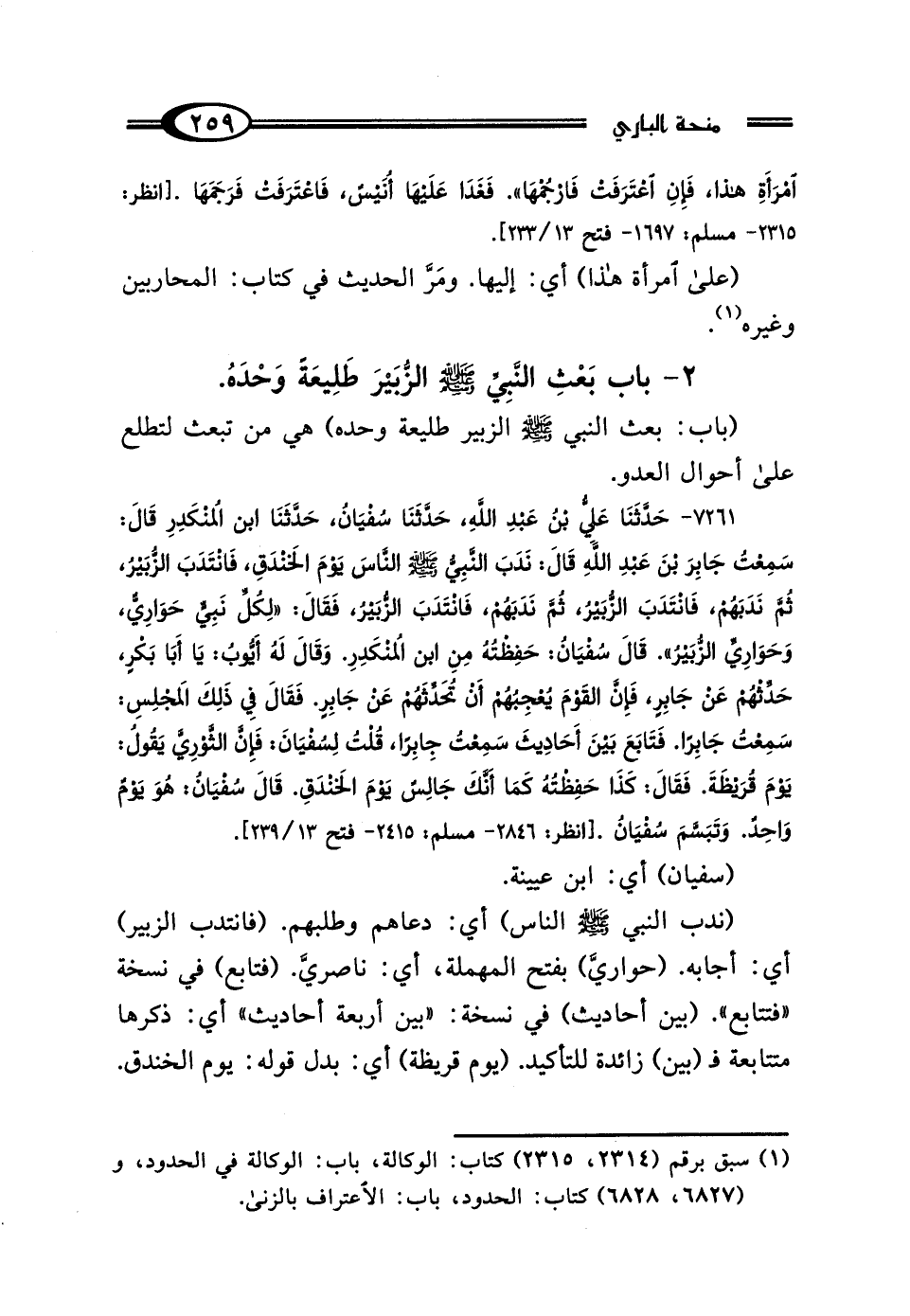 7261 - حَدَّثَنَا عَلِيُّ بْنُ عَبْدِ اللَّهِ بْنِ المَدِينِيِّ، حَدَّثَنَا سُفْيَانُ، حَدَّثَنَا ابْنُ المُنْكَدِرِ، قَالَ: سَمِعْتُ جَابِرَ بْنَ عَبْدِ اللَّهِ، قَالَ: نَدَبَ النَّبِيُّ صَلَّى اللهُ عَلَيْهِ وَسَلَّمَ النَّاسَ يَوْمَ الخَنْدَقِ فَانْتَدَبَ الزُّبَيْرُ، ثُمَّ نَدَبَهُمْ فَانْتَدَبَ الزُّبَيْرُ، ثُمَّ نَدَبَهُمْ فَانْتَدَبَ الزُّبَيْرُ، ثَلاَثًا، فَقَالَ: «لِكُلِّ نَبِيٍّ حَوَارِيٌّ وَحَوَارِيَّ الزُّبَيْرُ» قَالَ سُفْيَانُ: حَفِظْتُهُ مِنْ ابْنِ المُنْكَدِرِ، وَقَالَ لَهُ أَيُّوبُ: يَا أَبَا بَكْرٍ، حَدِّثْهُمْ عَنْ جَابِرٍ، فَإِنَّ القَوْمَ يُعْجِبُهُمْ أَنْ تُحَدِّثَهُمْ عَنْ جَابِرٍ، فَقَالَ: فِي ذَلِكَ المَجْلِسِ: سَمِعْتُ جَابِرًا - فَتَابَعَ بَيْنَ أَحَادِيثَ سَمِعْتُ جَابِرًا - قُلْتُ لِسُفْيَانَ: فَإِنَّ الثَّوْرِيَّ يَقُولُ: يَوْمَ قُرَيْظَةَ، فَقَالَ: كَذَا حَفِظْتُهُ مِنْهُ، كَمَا أَنَّكَ جَالِسٌ، يَوْمَ الخَنْدَقِ، قَالَ سُفْيَانُ هُوَ يَوْمٌ وَاحِدٌ، وَتَبَسَّمَ سُفْيَانُ.