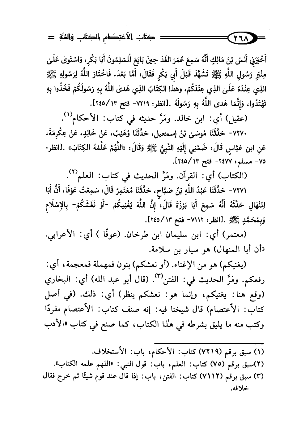 7271 - حَدَّثَنَا عَبْدُ اللَّهِ بْنُ صَبَّاحٍ، حَدَّثَنَا مُعْتَمِرٌ، قَال: سَمِعْتُ عَوْفًا، أَنَّ أَبَا المِنْهَالِ، حَدَّثَهُ أَنَّهُ سَمِعَ أَبَا بَرْزَةَ، قَال: "إِنَّ اللَّهَ يُغْنِيكُمْ - أَوْ نَعَشَكُمْ - بِالإِسْلامِ وَبِمُحَمَّدٍ صَلَّى اللهُ عَلَيْهِ وَسَلَّمَ"، قَال أَبُو عَبْدِ اللَّهِ: "وَقَعَ هَاهُنَا يُغْنِيكُمْ، وَإِنَّمَا هُوَ نَعَشَكُمْ يُنْظَرُ فِي أَصْلِ كِتَابِ الاعْتِصَامِ".