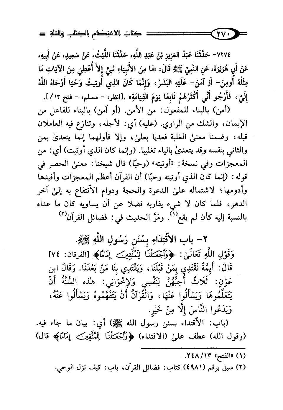 7274 - حَدَّثَنَا عَبْدُ العَزِيزِ بْنُ عَبْدِ اللَّهِ، حَدَّثَنَا اللَّيْثُ، عَنْ سَعِيدٍ، عَنْ أَبِيهِ، عَنْ أَبِي هُرَيْرَةَ، عَنِ النَّبِيِّ صَلَّى اللهُ عَلَيْهِ وَسَلَّمَ، قَال: "مَا مِنَ الأَنْبِيَاءِ نَبِيٌّ إلا أُعْطِيَ مِنَ الآيَاتِ مَا مِثْلُهُ أُومِنَ، أَوْ آمَنَ، عَلَيْهِ البَشَرُ، وَإِنَّمَا كَانَ الَّذِي أُوتِيتُ وَحْيًا أَوْحَاهُ اللَّهُ إِلَيَّ، فَأَرْجُو أَنِّي أَكْثَرُهُمْ تَابِعًا يَوْمَ القِيَامَةِ" [انظر: - مسلم: - فتح 13 /].