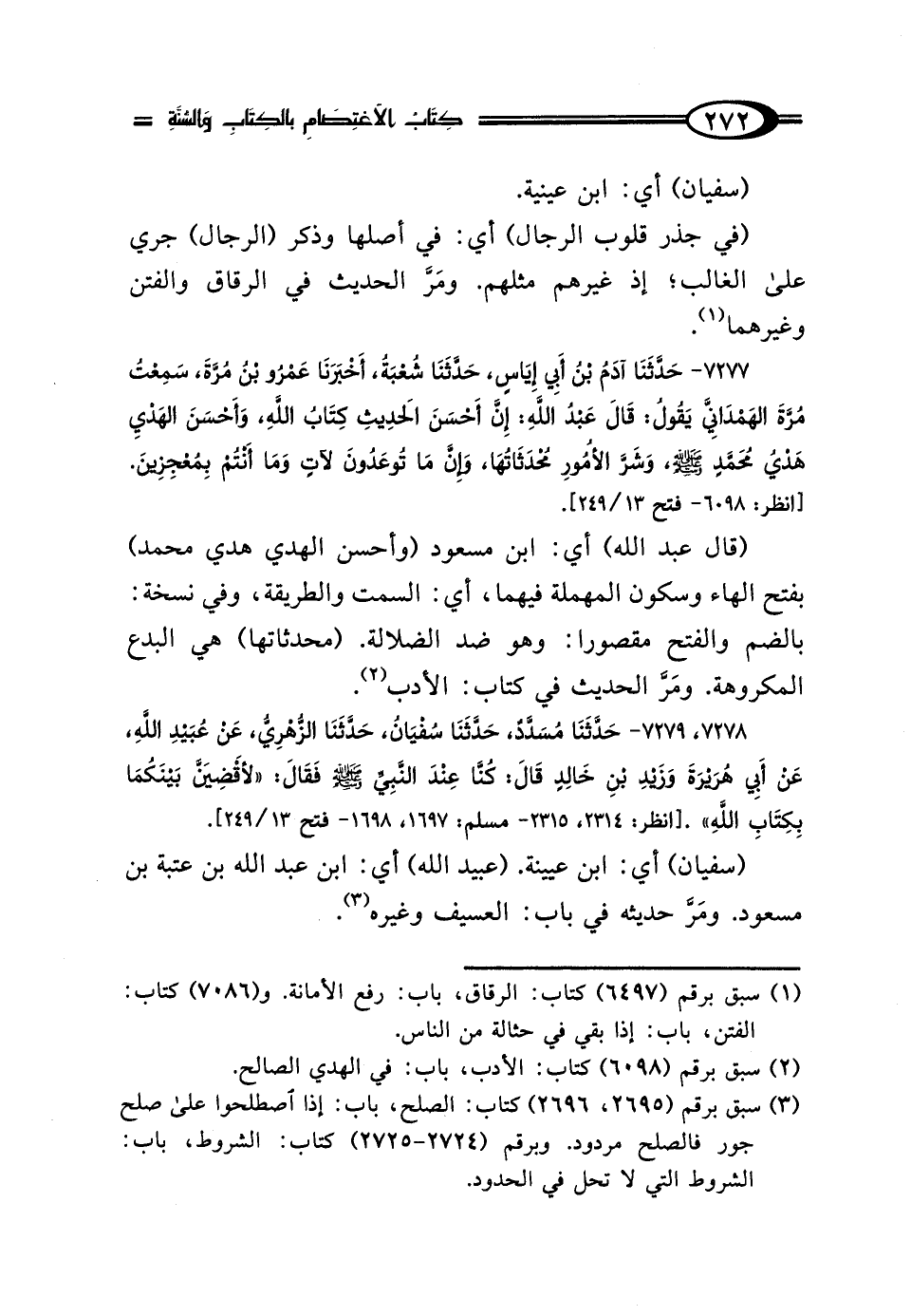7277 - حَدَّثَنَا آدَمُ بْنُ أَبِي إِيَاسٍ، حَدَّثَنَا شُعْبَةُ، أَخْبَرَنَا عَمْرُو بْنُ مُرَّةَ، سَمِعْتُ مُرَّةَ الهَمْدَانِيَّ، يَقُولُ: قَال عَبْدُ اللَّهِ: "إِنَّ أَحْسَنَ الحَدِيثِ كِتَابُ اللَّهِ، وَأَحْسَنَ الهَدْيِ هَدْيُ مُحَمَّدٍ صَلَّى اللهُ عَلَيْهِ وَسَلَّمَ، وَشَرَّ الأُمُورِ مُحْدَثَاتُهَا، وَإِنَّ مَا تُوعَدُونَ لآتٍ، وَمَا أَنْتُمْ بِمُعْجِزِينَ".