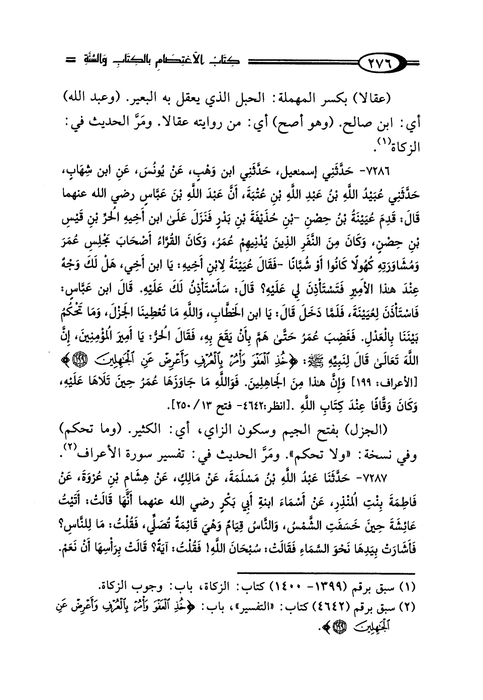 7286 - حَدَّثَنِي إِسْمَاعِيلُ، حَدَّثَنِي ابْنُ وَهْبٍ، عَنْ يُونُسَ، عَنِ ابْنِ شِهَابٍ، حَدَّثَنِي عُبَيْدُ اللَّهِ بْنُ عَبْدِ اللَّهِ بْنِ عُتْبَةَ، أَنَّ عَبْدَ اللَّهِ بْنَ عَبَّاسٍ رَضِيَ اللَّهُ عَنْهُمَا، قَال: قَدِمَ عُيَيْنَةُ بْنُ حِصْنِ بْنِ حُذَيْفَةَ بْنِ بَدْرٍ، فَنَزَلَ عَلَى ابْنِ أَخِيهِ الحُرِّ بْنِ قَيْسِ بْنِ حِصْنٍ، وَكَانَ مِنَ النَّفَرِ الَّذِينَ يُدْنِيهِمْ عُمَرُ، وَكَانَ القُرَّاءُ أَصْحَابَ مَجْلِسِ عُمَرَ وَمُشَاوَرَتِهِ، كُهُولًا كَانُوا أَوْ شُبَّانًا، فَقَال عُيَيْنَةُ لِابْنِ أَخِيهِ: يَا ابْنَ أَخِي، هَلْ لَكَ وَجْهٌ عِنْدَ هَذَا الأَمِيرِ فَتَسْتَأْذِنَ لِي عَلَيْهِ؟ قَال: سَأَسْتَأْذِنُ لَكَ عَلَيْهِ، قَال ابْنُ عَبَّاسٍ: فَاسْتَأْذَنَ لِعُيَيْنَةَ، فَلَمَّا دَخَلَ، قَال: يَا ابْنَ الخَطَّابِ، وَاللَّهِ مَا تُعْطِينَا الجَزْلَ، وَمَا تَحْكُمُ بَيْنَنَا بِالعَدْلِ، فَغَضِبَ عُمَرُ، حَتَّى هَمَّ بِأَنْ يَقَعَ بِهِ، فَقَال الحُرُّ: يَا أَمِيرَ المُؤْمِنِينَ، إِنَّ اللَّهَ تَعَالى قَال لِنَبِيِّهِ صَلَّى اللهُ عَلَيْهِ وَسَلَّمَ: {خُذِ العَفْوَ وَأْمُرْ بِالعُرْفِ وَأَعْرِضْ عَنِ الجَاهِلِينَ} [الأعراف: 199]، وَإِنَّ هَذَا مِنَ الجَاهِلِينَ، "فَوَاللَّهِ مَا جَاوَزَهَا عُمَرُ حِينَ تَلاهَا عَلَيْهِ، وَكَانَ وَقَّافًا عِنْدَ كِتَابِ اللَّهِ".