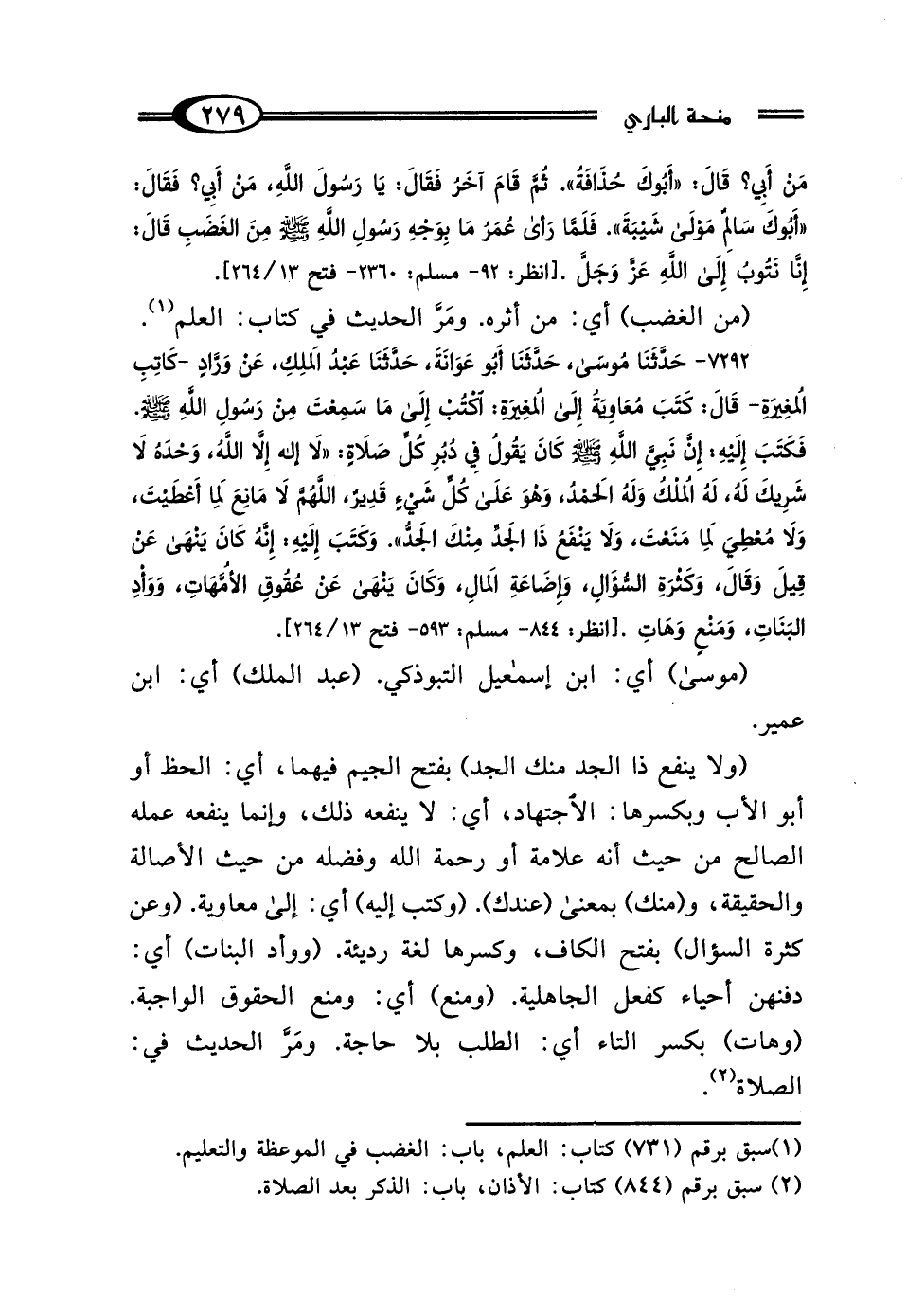 (ولا ينفع ذا الجد منك الجد) بفتح الجيم فيهما، أي: الحظ أو أبوالأب وبكسرها: الاجتهاد، أي: لا ينفعه ذلك، وإنما ينفعه عمله الصالح من حيث أنه علامة أو رحمة الله وفضله من حيث الأصالة والحقيقة، و (منك) بمعنى (عندك). (وكتب إليه) أي: إلى معاوية. (وعن كثرة السؤال) بفتح الكاف، وكسرها لغة رديىة. (ووأد البنات) أي: دفنهن أحياء كفعل الجاهلية. (ومنع) أي: ومنع الحقوق الواجبة. (وهات) بكسر التاء أي: الطلب بلا حاجة. ومرَّ الحديث في: الصلاة (¬2).