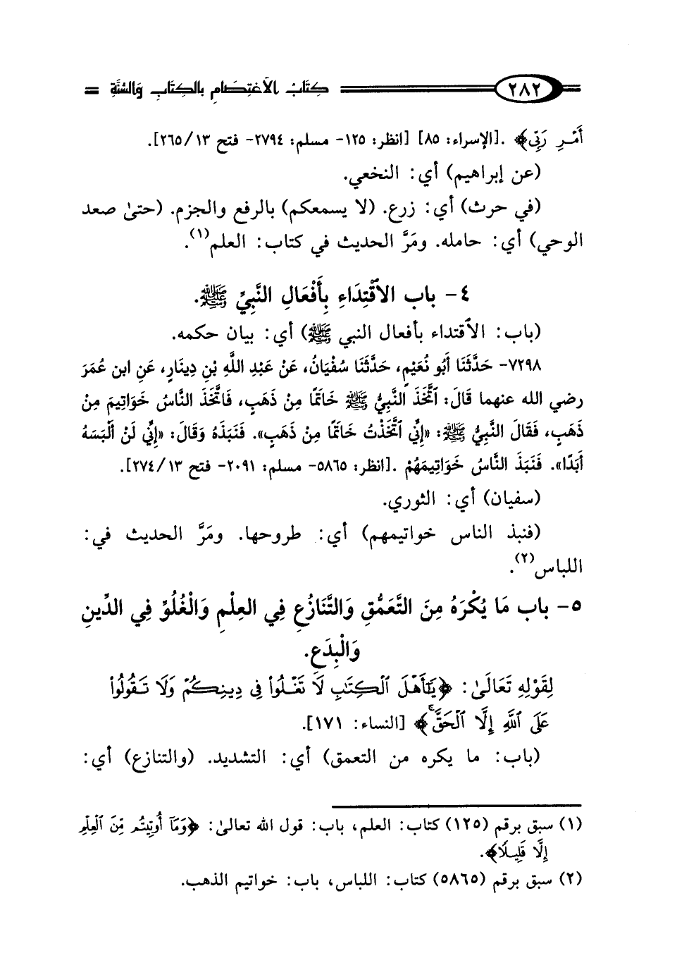 5 - بَابُ مَا يُكْرَهُ مِنَ التَّعَمُّقِ وَالتَّنَازُعِ فِي العِلْمِ، وَالغُلُوِّ فِي الدِّينِ وَالبِدَعِ