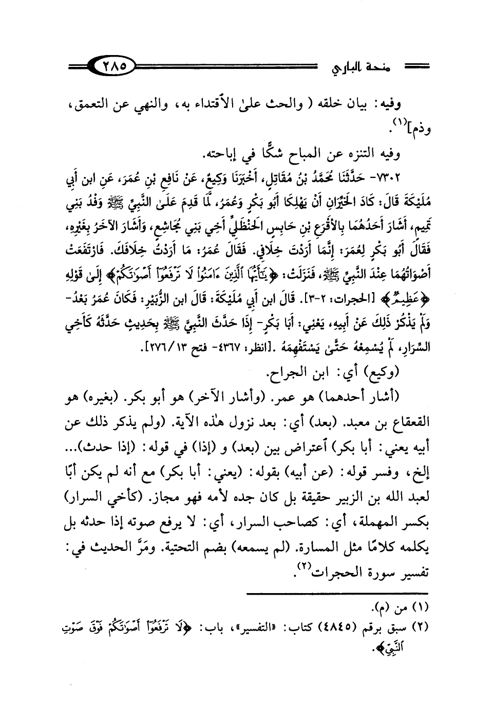 7302 - حَدَّثَنَا مُحَمَّدُ بْنُ مُقَاتِلٍ، أَخْبَرَنَا وَكِيعٌ، أَخْبَرَنَا نَافِعُ بْنُ عُمَرَ، عَنِ ابْنِ أَبِي مُلَيْكَةَ، قَال: كَادَ الخَيِّرَانِ أَنْ يَهْلِكَا أَبُو بَكْرٍ وَعُمَرُ، لَمَّا قَدِمَ عَلَى النَّبِيِّ صَلَّى اللهُ عَلَيْهِ وَسَلَّمَ وَفْدُ بَنِي تَمِيمٍ، أَشَارَ أَحَدُهُمَا بِالأَقْرَعِ بْنِ حَابِسٍ التَّمِيمِيِّ الحَنْظَلِيِّ أَخِي بَنِي مُجَاشِعٍ، وَأَشَارَ الآخَرُ بِغَيْرِهِ، فَقَال أَبُو بَكْرٍ لِعُمَرَ: إِنَّمَا أَرَدْتَ خِلافِي، فَقَال عُمَرُ: مَا أَرَدْتُ خِلافَكَ، فَارْتَفَعَتْ أَصْوَاتُهُمَا عِنْدَ النَّبِيِّ صَلَّى اللهُ عَلَيْهِ وَسَلَّمَ، فَنَزَلَتْ: {يَا أَيُّهَا الَّذِينَ آمَنُوا لَا تَرْفَعُوا أَصْوَاتَكُمْ فَوْقَ صَوْتِ النَّبِيِّ} إِلَى قَوْلِهِ {عَظِيمٌ} [الحجرات: 2 - 3]، قَال ابْنُ أَبِي مُلَيْكَةَ، قَال ابْنُ الزُّبَيْرِ، فَكَانَ عُمَرُ بَعْدُ، وَلَمْ يَذْكُرْ ذَلِكَ عَنْ أَبِيهِ يَعْنِي أَبَا بَكْرٍ، إِذَا حَدَّثَ النَّبِيَّ صَلَّى اللهُ عَلَيْهِ وَسَلَّمَ بِحَدِيثٍ حَدَّثَهُ كَأَخِي السِّرَارِ لَمْ يُسْمِعْهُ حَتَّى يَسْتَفْهِمَهُ.