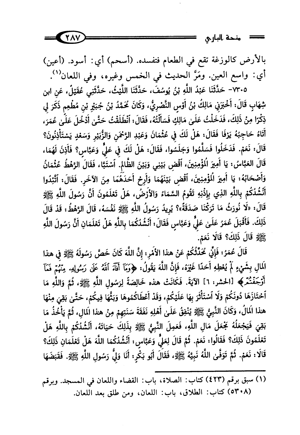 7305 - حَدَّثَنَا عَبْدُ اللَّهِ بْنُ يُوسُفَ، حَدَّثَنَا اللَّيْثُ، حَدَّثَنِي عُقَيْلٌ، عَنِ ابْنِ شِهَابٍ، قَال: أَخْبَرَنِي مَالِكُ بْنُ أَوْسٍ النَّصْرِيُّ، وَكَانَ مُحَمَّدُ بْنُ جُبَيْرِ بْنِ مُطْعِمٍ ذَكَرَ لِي ذِكْرًا مِنْ ذَلِكَ، فَدَخَلْتُ عَلَى مَالِكٍ فَسَأَلْتُهُ، فَقَال: انْطَلَقْتُ حَتَّى أَدْخُلَ عَلَى عُمَرَ أَتَاهُ حَاجِبُهُ يَرْفَا، فَقَال: هَلْ لَكَ فِي عُثْمَانَ، وَعَبْدِ الرَّحْمَنِ، وَالزُّبَيْرِ، وَسَعْدٍ يَسْتَأْذِنُونَ، قَال: نَعَمْ، فَدَخَلُوا فَسَلَّمُوا وَجَلَسُوا، فَقَال: هَلْ لَكَ فِي عَلِيٍّ، وَعَبَّاسٍ، فَأَذِنَ لَهُمَا، قَال العَبَّاسُ: يَا أَمِيرَ المُؤْمِنِينَ، اقْضِ بَيْنِي وَبَيْنَ الظَّالِمِ اسْتَبَّا، فَقَال الرَّهْطُ: - عُثْمَانُ وَأَصْحَابُهُ -: يَا أَمِيرَ المُؤْمِنِينَ اقْضِ بَيْنَهُمَا، وَأَرِحْ أَحَدَهُمَا مِنَ الآخَرِ، فَقَال: اتَّئِدُوا، أَنْشُدُكُمْ بِاللَّهِ الَّذِي بِإِذْنِهِ تَقُومُ السَّمَاءُ وَالأَرْضُ، هَلْ تَعْلَمُونَ أَنَّ رَسُولَ اللَّهِ صَلَّى اللهُ عَلَيْهِ وَسَلَّمَ قَال: "لَا نُورَثُ مَا تَرَكْنَا صَدَقَةٌ" يُرِيدُ رَسُولُ اللَّهِ صَلَّى اللهُ عَلَيْهِ وَسَلَّمَ نَفْسَهُ؟ قَال الرَّهْطُ: قَدْ قَال ذَلِكَ، فَأَقْبَلَ عُمَرُ عَلَى عَلِيٍّ، وَعَبَّاسٍ فَقَال: أَنْشُدُكُمَا بِاللَّهِ هَلْ تَعْلَمَانِ أَنَّ رَسُولَ اللَّهِ صَلَّى اللهُ عَلَيْهِ وَسَلَّمَ قَال ذَلِكَ؟ قَالا: نَعَمْ، قَال عُمَرُ: فَإِنِّي مُحَدِّثُكُمْ عَنْ هَذَا الأَمْرِ، إِنَّ اللَّهَ كَانَ خَصَّ رَسُولَهُ صَلَّى اللهُ عَلَيْهِ وَسَلَّمَ فِي هَذَا المَالِ بِشَيْءٍ لَمْ يُعْطِهِ أَحَدًا غَيْرَهُ، فَإِنَّ اللَّهَ يَقُولُ: {مَا أَفَاءَ اللَّهُ عَلَى رَسُولِهِ مِنْهُمْ فَمَا أَوْجَفْتُمْ} [الحشر: 6] الآيَةَ، فَكَانَتْ هَذِهِ خَالِصَةً لِرَسُولِ اللَّهِ صَلَّى اللهُ عَلَيْهِ وَسَلَّمَ، ثُمَّ وَاللَّهِ مَا احْتَازَهَا دُونَكُمْ، وَلَا اسْتَأْثَرَ بِهَا عَلَيْكُمْ، وَقَدْ أَعْطَاكُمُوهَا وَبَثَّهَا فِيكُمْ حَتَّى بَقِيَ مِنْهَا هَذَا المَالُ، وَكَانَ النَّبِيُّ صَلَّى اللهُ عَلَيْهِ وَسَلَّمَ يُنْفِقُ عَلَى أَهْلِهِ نَفَقَةَ سَنَتِهِمْ مِنْ هَذَا المَالِ، ثُمَّ يَأْخُذُ مَا بَقِيَ فَيَجْعَلُهُ مَجْعَلَ مَالِ اللَّهِ، فَعَمِلَ النَّبِيُّ صَلَّى اللهُ عَلَيْهِ وَسَلَّمَ بِذَلِكَ حَيَاتَهُ، أَنْشُدُكُمْ بِاللَّهِ: هَلْ تَعْلَمُونَ ذَلِكَ؟ فَقَالُوا: نَعَمْ، ثُمَّ قَال لِعَلِيٍّ وَعَبَّاسٍ: أَنْشُدُكُمَا اللَّهَ، هَلْ تَعْلَمَانِ ذَلِكَ؟ قَالا: نَعَمْ، ثُمَّ تَوَفَّى اللَّهُ نَبِيَّهُ صَلَّى اللهُ عَلَيْهِ وَسَلَّمَ، فَقَال أَبُو بَكْرٍ: أَنَا وَلِيُّ رَسُولِ اللَّهِ صَلَّى اللهُ عَلَيْهِ وَسَلَّمَ، فَقَبَضَهَا