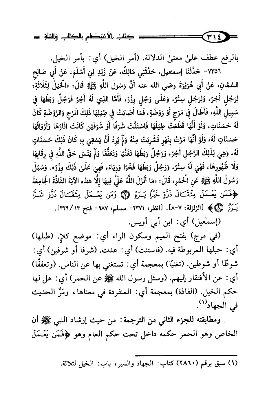 7356 - حَدَّثَنَا إِسْمَاعِيلُ، حَدَّثَنِي مَالِكٌ، عَنْ زَيْدِ بْنِ أَسْلَمَ، عَنْ أَبِي صَالِحٍ السَّمَّانِ، عَنْ أَبِي هُرَيْرَةَ رَضِيَ اللَّهُ عَنْهُ: أَنَّ رَسُولَ اللَّهِ صَلَّى اللهُ عَلَيْهِ وَسَلَّمَ، قَال: "الخَيْلُ لِثَلاثَةٍ: لِرَجُلٍ أَجْرٌ، وَلِرَجُلٍ سِتْرٌ، وَعَلَى رَجُلٍ وزْرٌ، فَأَمَّا الَّذِي لَهُ أَجْرٌ: فَرَجُلٌ رَبَطَهَا فِي سَبِيلِ اللَّهِ، فَأَطَال لَهَا فِي مَرْجٍ أَوْ رَوْضَةٍ، فَمَا أَصَابَتْ فِي طِيَلِهَا ذَلِكَ مِنَ المَرْجِ أَو الرَّوْضَةِ كَانَ لَهُ حَسَنَاتٍ، وَلَوْ أَنَّهَا قَطَعَتْ طِيَلَهَا، فَاسْتَنَّتْ شَرَفًا أَوْ شَرَفَيْنِ، كَانَتْ آثَارُهَا وَأَرْوَاثُهَا حَسَنَاتٍ لَهُ، وَلَوْ أَنَّهَا مَرَّتْ بِنَهَرٍ فَشَرِبَتْ مِنْهُ وَلَمْ يُرِدْ أَنْ يَسْقِيَ بِهِ كَانَ ذَلِكَ حَسَنَاتٍ لَهُ، وَهِيَ لِذَلِكَ الرَّجُلِ أَجْرٌ، وَرَجُلٌ رَبَطَهَا تَغَنِّيًا وَتَعَفُّفًا، وَلَمْ يَنْسَ حَقَّ اللَّهِ فِي رِقَابِهَا وَلَا ظُهُورِهَا، فَهِيَ لَهُ سِتْرٌ، وَرَجُلٌ رَبَطَهَا فَخْرًا وَرِيَاءً، فَهِيَ عَلَى ذَلِكَ وزْرٌ "وَسُئِلَ رَسُولُ اللَّهِ صَلَّى اللهُ عَلَيْهِ وَسَلَّمَ عَنِ الحُمُرِ، قَال: "مَا أَنْزَلَ اللَّهُ عَلَيَّ فِيهَا إلا هَذِهِ الآيَةَ الفَاذَّةَ الجَامِعَةَ" {فَمَنْ يَعْمَلْ مِثْقَال ذَرَّةٍ خَيْرًا يَرَهُ، وَمَنْ يَعْمَلْ مِثْقَال ذَرَّةٍ شَرًّا يَرَهُ} [الزلزلة: 8] [انظر: 2371 - مسلم: 987 - فتح 13/ 329].