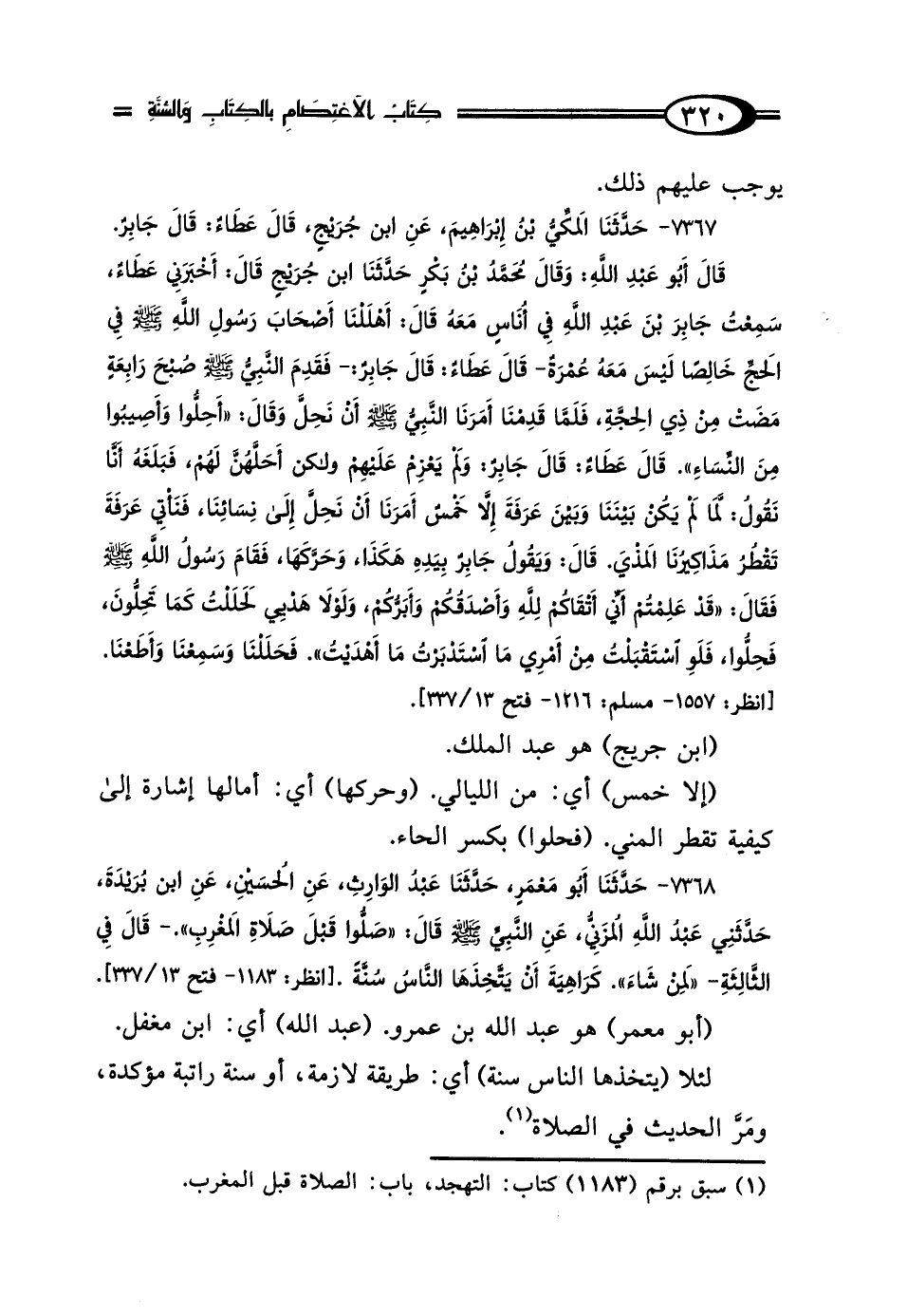 7367 - حَدَّثَنَا المَكِّيُّ بْنُ إِبْرَاهِيمَ، عَنِ ابْنِ جُرَيْجٍ، قَال عَطَاءٌ: قَال جَابِرٌ: قَال أَبُو عَبْدِ اللَّهِ: وَقَال مُحَمَّدُ بْنُ بَكْرٍ البُرْسَانِيُّ، حَدَّثَنَا ابْنُ جُرَيْجٍ، قَال: أَخْبَرَنِي عَطَاءٌ، سَمِعْتُ جَابِرَ بْنَ عَبْدِ اللَّهِ فِي أُنَاسٍ مَعَهُ قَال: أَهْلَلْنَا أَصْحَابَ رَسُولِ اللَّهِ صَلَّى اللهُ عَلَيْهِ وَسَلَّمَ فِي الحَجِّ خَالِصًا لَيْسَ مَعَهُ عُمْرَةٌ، قَال عَطَاءٌ: قَال جَابِرٌ: فَقَدِمَ النَّبِيُّ صَلَّى اللهُ عَلَيْهِ وَسَلَّمَ صُبْحَ رَابِعَةٍ مَضَتْ مِنْ ذِي الحِجَّةِ، فَلَمَّا قَدِمْنَا أَمَرَنَا النَّبِيُّ صَلَّى اللهُ عَلَيْهِ وَسَلَّمَ أَنْ نَحِلَّ، وَقَال: "أَحِلُّوا وَأَصِيبُوا مِنَ النِّسَاءِ"، قَال عَطَاءٌ: قَال جَابِرٌ: وَلَمْ يَعْزِمْ عَلَيْهِمْ، وَلَكِنْ أَحَلَّهُنَّ لَهُمْ، فَبَلَغَهُ أَنَّا نَقُولُ: لَمَّا لَمْ يَكُنْ بَيْنَنَا وَبَيْنَ عَرَفَةَ إلا خَمْسٌ، أَمَرَنَا أَنْ نَحِلَّ إِلَى نِسَائِنَا، فَنَأْتِي عَرَفَةَ تَقْطُرُ مَذَاكِيرُنَا المَذْيَ، قَال: وَيَقُولُ جَابِرٌ بِيَدِهِ هَكَذَا وَحَرَّكَهَا، فَقَامَ رَسُولُ اللَّهِ صَلَّى اللهُ عَلَيْهِ وَسَلَّمَ فَقَال: "قَدْ عَلِمْتُمْ أَنِّي أَتْقَاكُمْ لِلَّهِ وَأَصْدَقُكُمْ وَأَبَرُّكُمْ، وَلَوْلا هَدْيِي لَحَلَلْتُ كَمَا تَحِلُّونَ، فَحِلُّوا، فَلَو اسْتَقْبَلْتُ مِنْ أَمْرِي مَا اسْتَدْبَرْتُ مَا أَهْدَيْتُ"، فَحَلَلْنَا وَسَمِعْنَا وَأَطَعْنَا.