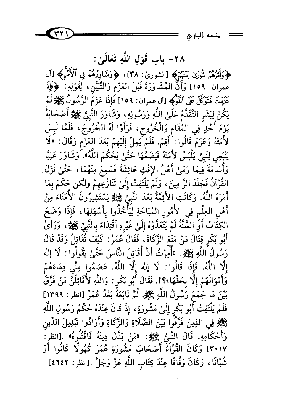 28 - بَابُ قَوْلِ اللَّهِ تَعَالى: {وَأَمْرُهُمْ شُورَى بَيْنَهُمْ} [الشورى: 38]، {وَشَاورْهُمْ فِي الأَمْرِ} [آل عمران: 159] "وَأَنَّ المُشَاوَرَةَ قَبْلَ العَزْمِ وَالتَّبَيُّنِ لِقَوْلِهِ": {فَإِذَا عَزَمْتَ فَتَوَكَّلْ عَلَى اللَّهِ} [آل عمران: 159] "فَإِذَا عَزَمَ الرَّسُولُ صَلَّى اللهُ عَلَيْهِ وَسَلَّمَ لَمْ يَكُنْ لِبَشَرٍ التَّقَدُّمُ عَلَى اللَّهِ وَرَسُولِهِ"