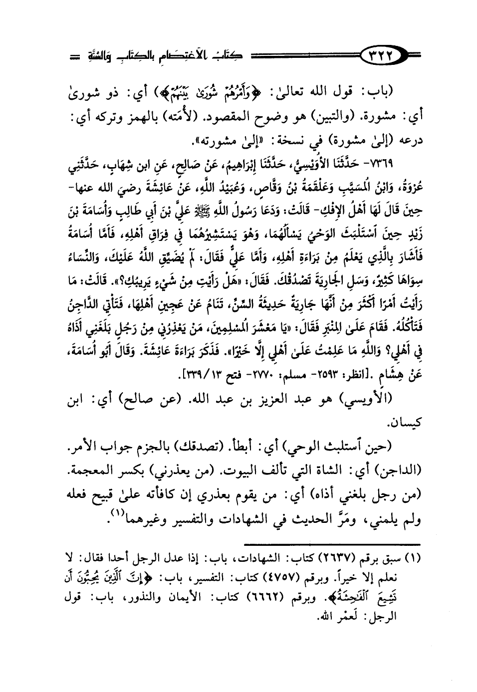 (باب: قول الله تعالى: {وَأَمْرُهُمْ شُورَى بَيْنَهُمْ}) أي: ذو شورى أي: مشورة. (والتبين) هو وضوح المقصود. (لأمَته) بالهمز وتركه أي: درعه (إلى مشورة) في نسخة: "إلى مشورته".