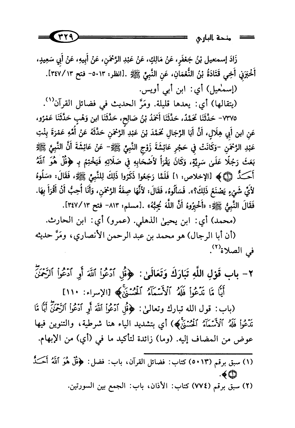 2 - بَابُ قَوْلِ اللَّهِ تَبَارَكَ وَتَعَالى: {قُلِ ادْعُوا اللَّهَ أَو ادْعُوا الرَّحْمَنَ أَيًّا مَا تَدْعُوا فَلَهُ الأَسْمَاءُ الحُسْنَى} [الإسراء: 110]