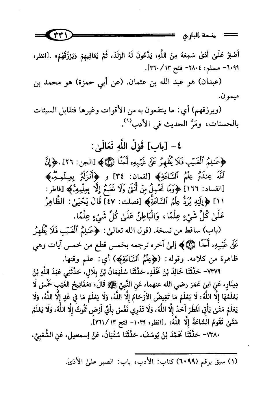 4 - بَابُ قَوْلِ اللَّهِ تَعَالى: {عَالِمُ الغَيْبِ فَلَا يُظْهِرُ عَلَى غَيْبِهِ أَحَدًا} [الجن: 26]، وَ {إِنَّ اللَّهَ عِنْدَهُ عِلْمُ السَّاعَةِ} [لقمان: 34]، وَ {أَنْزَلَهُ بِعِلْمِهِ} [النساء: 166]، {وَمَا تَحْمِلُ مِنْ أُنْثَى وَلَا تَضَعُ إلا بِعِلْمِهِ} [فاطر: 11]، {إِلَيْهِ يُرَدُّ عِلْمُ السَّاعَةِ} [فصلت: 47]