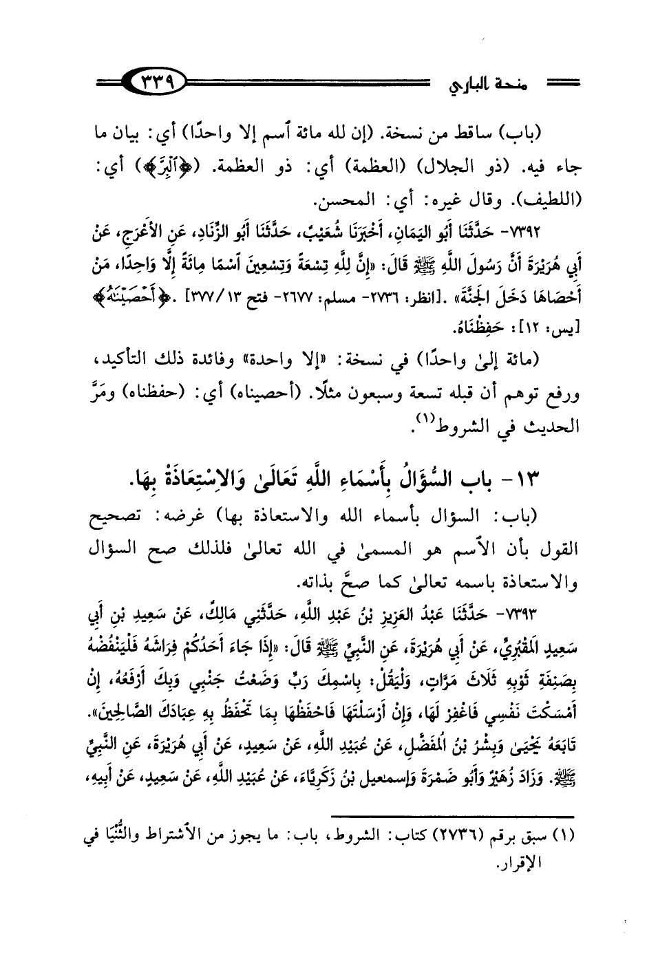 7392 - حَدَّثَنَا أَبُو اليَمَانِ، أَخْبَرَنَا شُعَيْبٌ، حَدَّثَنَا أَبُو الزِّنَادِ، عَنِ الأَعْرَجِ، عَنْ أَبِي هُرَيْرَةَ: أَنَّ رَسُولَ اللَّهِ صَلَّى اللهُ عَلَيْهِ وَسَلَّمَ قَال: "إِنَّ لِلَّهِ تِسْعَةً وَتِسْعِينَ اسْمًا، مِائَةً إلا وَاحِدًا، مَنْ أَحْصَاهَا دَخَلَ الجَنَّةَ".