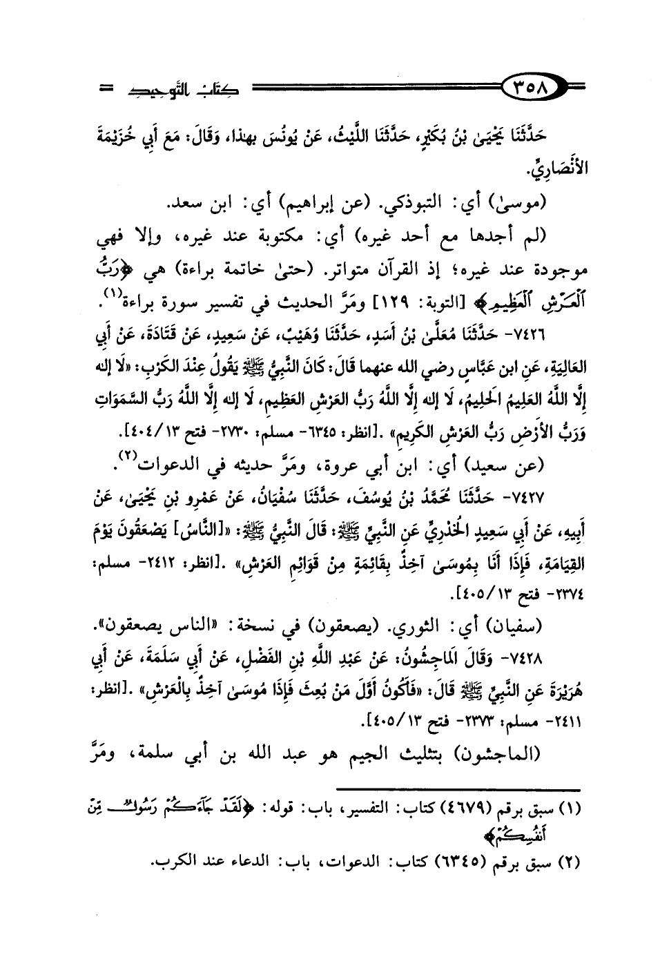 7427 - حَدَّثَنَا مُحَمَّدُ بْنُ يُوسُفَ، حَدَّثَنَا سُفْيَانُ، عَنْ عَمْرِو بْنِ يَحْيَى، عَنْ أَبِيهِ، عَنْ أَبِي سَعِيدٍ الخُدْرِيِّ، عَنِ النَّبِيِّ صَلَّى اللهُ عَلَيْهِ وَسَلَّمَ، قَال: " [النَّاسُ] يَصْعَقُونَ يَوْمَ القِيَامَةِ، فَإِذَا أَنَا بِمُوسَى آخِذٌ بِقَائِمَةٍ مِنْ قَوَائِمِ العَرْشِ".