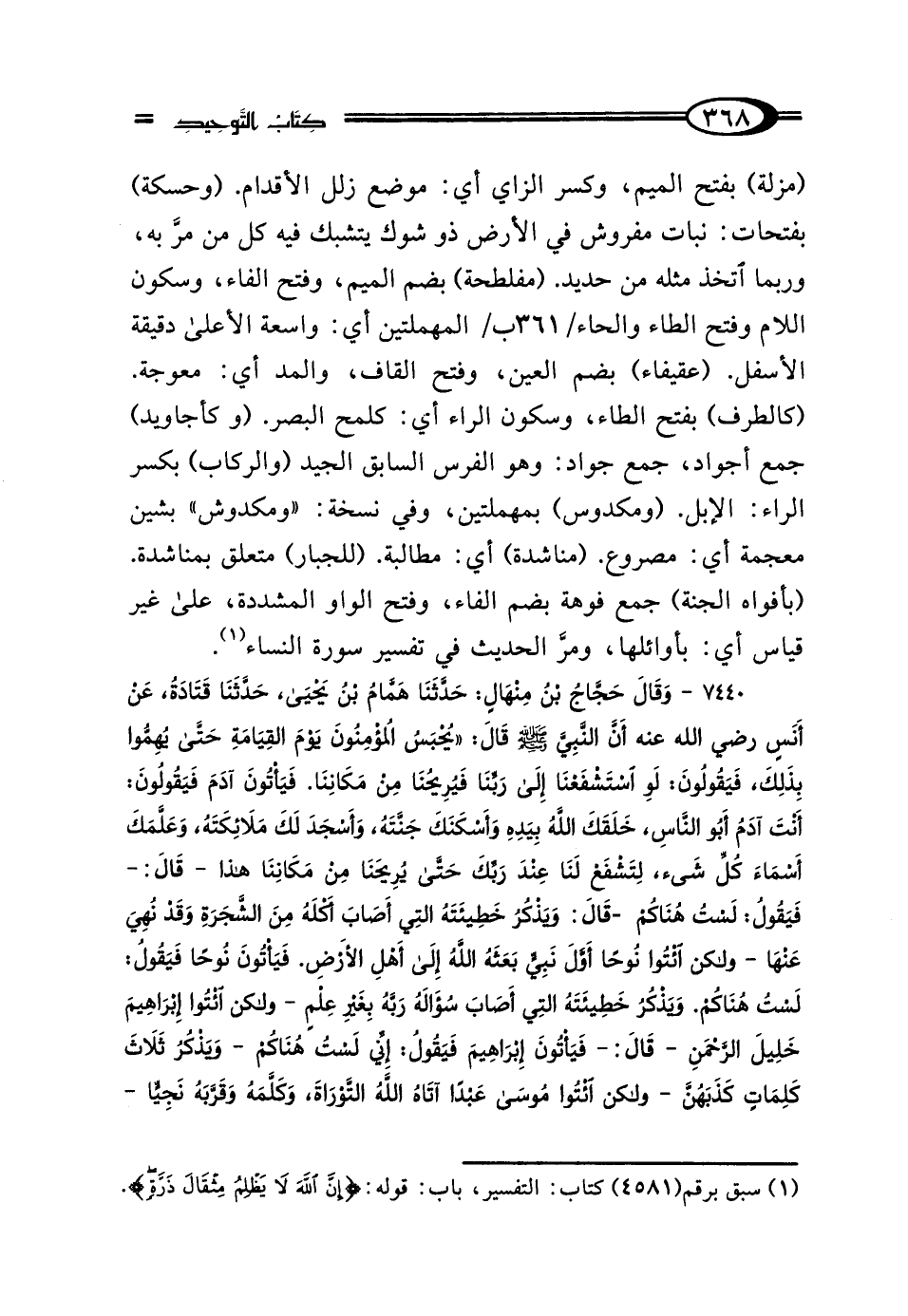 (مزلة) بفتح الميم، وكسر الزاي أي: موضع زلل الأقدام. (وحسكة) بفتحات: نبات مفروش في الأرض ذو شوك يتشبك فيه كل من مرَّ به، وربما اتخذ مثله من حديد. (مفلطحة) بضم الميم، وفتح الفاء، وسكون اللام وفتح الطاء والحاء المهملتين أي: واسعة الأعلى دقيقة الأسفل. (عقيفاء) بضم العين، وفتح القاف، والمد أي: معوجة. (كالطرف) بفتح الطاء، وسكون الراء أقي: كلمح البصر. (وكأجاويد) جمع أجواد، جمع جواد: وهو الفرس السابق الجيد (والركاب) بكسر الراء: الإبل. (ومكدوس) بمهملتين، وفي نسخة: "ومكدوش" بشين معجمة أي: مصروع. (مناشدة) أي: مطالبة. (للجبار) متعلق بمناشدة. (بأفواه الجنة) جمع فوهة بضم الفاء، وفتح الواو المشددة، على غير قياس أي: بأوائلها، ومرَّ الحديث في تفسير سورة النساء (¬1).