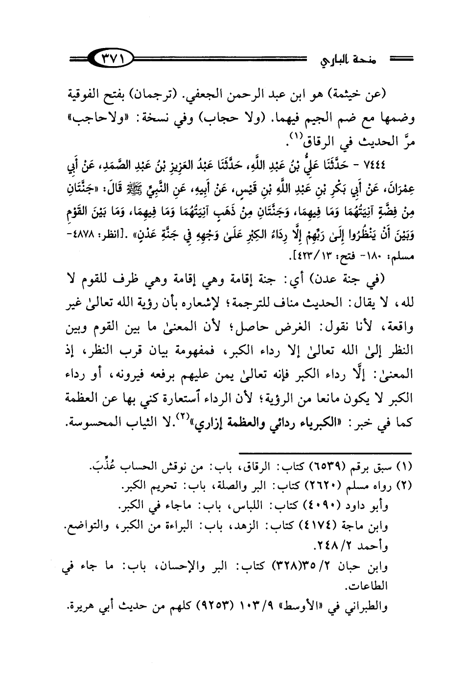 7444 - حَدَّثَنَا عَلِيُّ بْنُ عَبْدِ اللَّهِ، حَدَّثَنَا عَبْدُ العَزِيزِ بْنُ عَبْدِ الصَّمَدِ، عَنْ أَبِي عِمْرَانَ، عَنْ أَبِي بَكْرِ بْنِ عَبْدِ اللَّهِ بْنِ قَيْسٍ، عَنْ أَبِيهِ، عَنِ النَّبِيِّ صَلَّى اللهُ عَلَيْهِ وَسَلَّمَ قَال: "جَنَّتَانِ مِنْ فِضَّةٍ، آنِيَتُهُمَا وَمَا فِيهِمَا، وَجَنَّتَانِ مِنْ ذَهَبٍ، آنِيَتُهُمَا وَمَا فِيهِمَا، وَمَا بَيْنَ القَوْمِ وَبَيْنَ أَنْ يَنْظُرُوا إِلَى رَبِّهِمْ إلا رِدَاءُ الكِبْرِ عَلَى وَجْهِهِ فِي جَنَّةِ عَدْنٍ".
