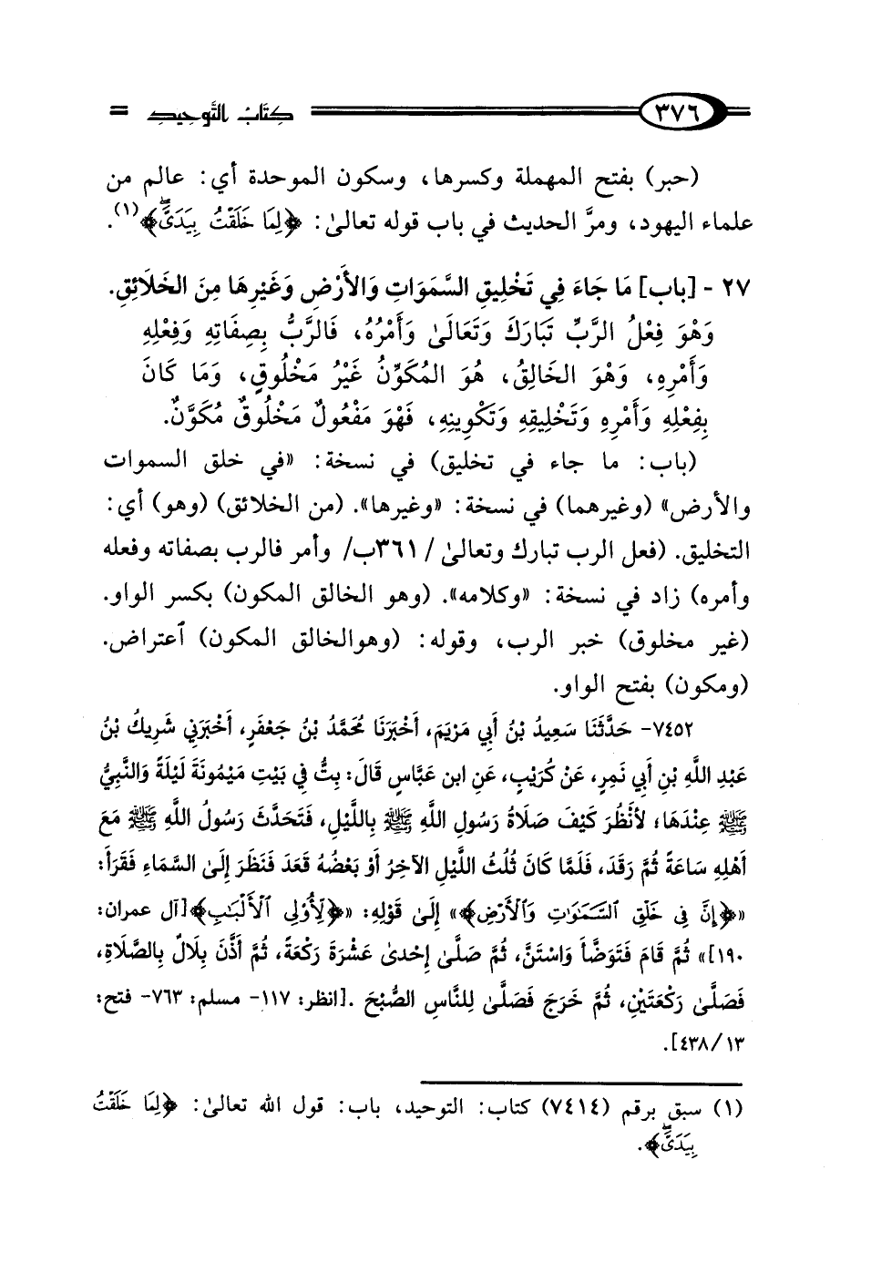 7452 - حَدَّثَنَا سَعِيدُ بْنُ أَبِي مَرْيَمَ، أَخْبَرَنَا مُحَمَّدُ بْنُ جَعْفَرٍ، أَخْبَرَنِي شَرِيكُ بْنُ عَبْدِ اللَّهِ بْنِ أَبِي نَمِرٍ، عَنْ كُرَيْبٍ، عَنِ ابْنِ عَبَّاسٍ، قَال: بِتُّ فِي بَيْتِ مَيْمُونَةَ لَيْلَةً، وَالنَّبِيُّ صَلَّى اللهُ عَلَيْهِ وَسَلَّمَ عِنْدَهَا، لِأَنْظُرَ كَيْفَ صَلاةُ رَسُولِ اللَّهِ صَلَّى اللهُ عَلَيْهِ وَسَلَّمَ بِاللَّيْلِ، "فَتَحَدَّثَ رَسُولُ اللَّهِ صَلَّى اللهُ عَلَيْهِ وَسَلَّمَ مَعَ أَهْلِهِ سَاعَةً ثُمَّ رَقَدَ، فَلَمَّا كَانَ ثُلُثُ اللَّيْلِ الآخِرُ، أَوْ بَعْضُهُ، قَعَدَ فَنَظَرَ إِلَى السَّمَاءِ فَقَرَأَ": {إِنَّ فِي خَلْقِ السَّمَوَاتِ وَالأَرْضِ} إِلَى قَوْلِهِ {لِأُولِي الأَلْبَابِ} [آل عمران: 190]، "ثُمَّ قَامَ فَتَوَضَّأَ وَاسْتَنَّ، ثُمَّ صَلَّى إِحْدَى عَشْرَةَ رَكْعَةً"، ثُمَّ أَذَّنَ بِلالٌ بِالصَّلاةِ، "فَصَلَّى رَكْعَتَيْنِ، ثُمَّ خَرَجَ فَصَلَّى لِلنَّاسِ الصُّبْحَ".