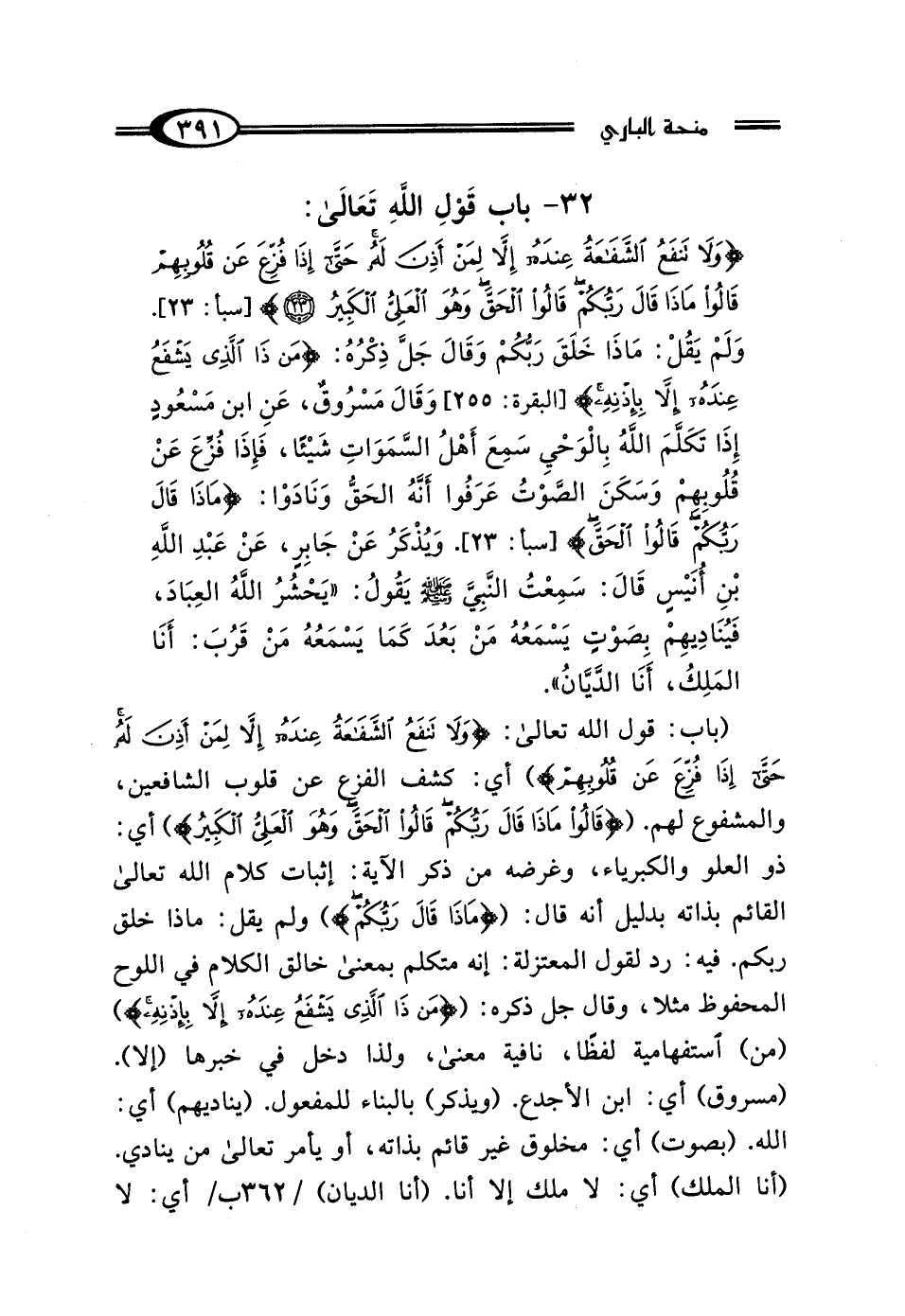 32 - بَابُ قَوْلِ اللَّهِ تَعَالى: {وَلَا تَنْفَعُ الشَّفَاعَةُ عِنْدَهُ إلا لِمَنْ أَذِنَ لَهُ حَتَّى إِذَا فُزِّعَ عَنْ قُلُوبِهِمْ قَالُوا مَاذَا قَال رَبُّكُمْ قَالُوا الحَقَّ وَهُوَ العَلِيُّ الكَبِيرُ} [سبأ: 23] وَلَمْ يَقُلْ: مَاذَا خَلَقَ رَبُّكُمْ