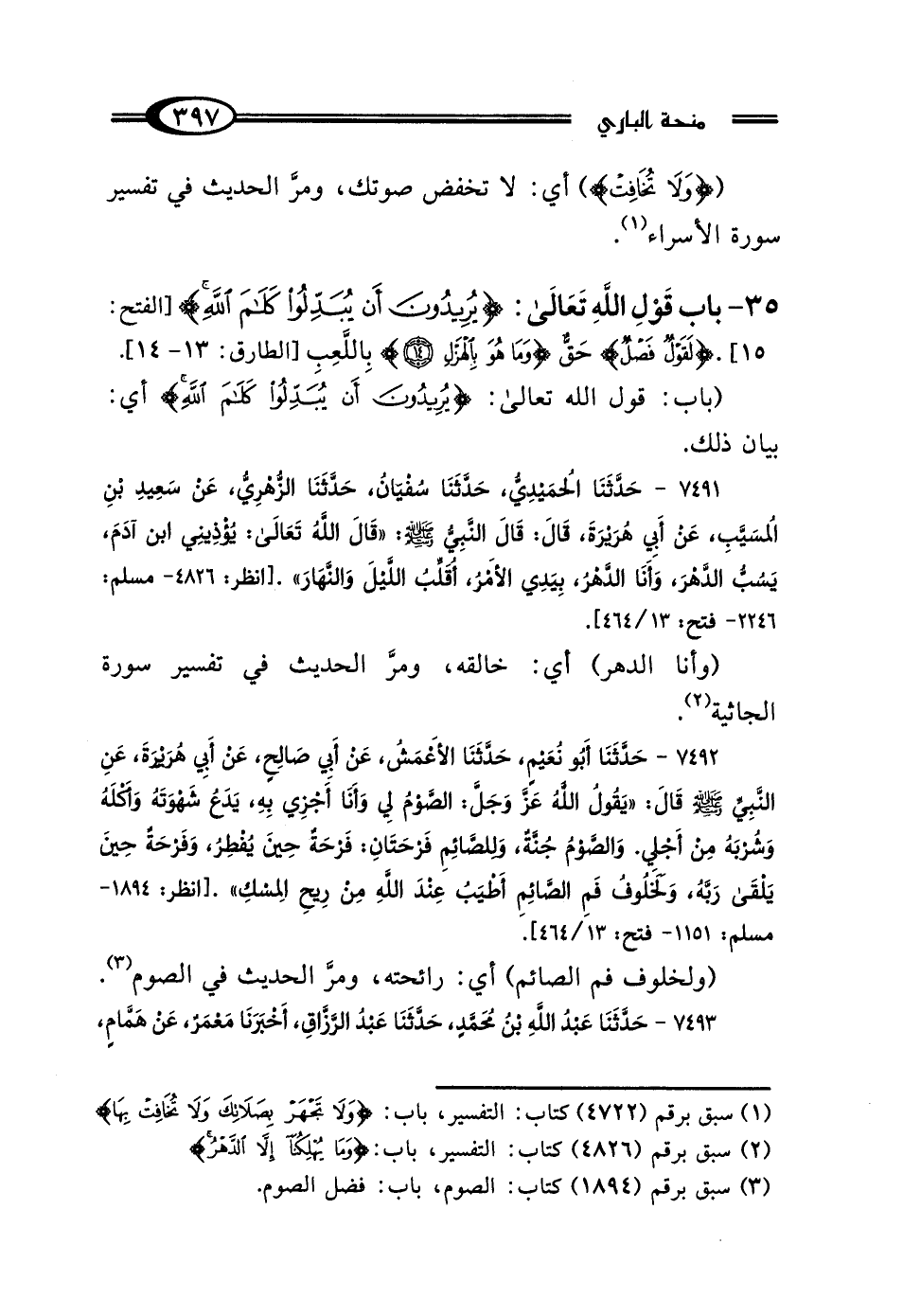 7491 - حَدَّثَنَا الحُمَيْدِيُّ، حَدَّثَنَا سُفْيَانُ، حَدَّثَنَا الزُّهْرِيُّ، عَنْ سَعِيدِ بْنِ المُسَيِّبِ، عَنْ أَبِي هُرَيْرَةَ، قَال: قَال النَّبِيُّ صَلَّى اللهُ عَلَيْهِ وَسَلَّمَ: "قَال اللَّهُ تَعَالى: يُؤْذِينِي ابْنُ آدَمَ يَسُبُّ الدَّهْرَ:، وَأَنَا الدَّهْرُ، بِيَدِي الأَمْرُ، أُقَلِّبُ اللَّيْلَ وَالنَّهَارَ".