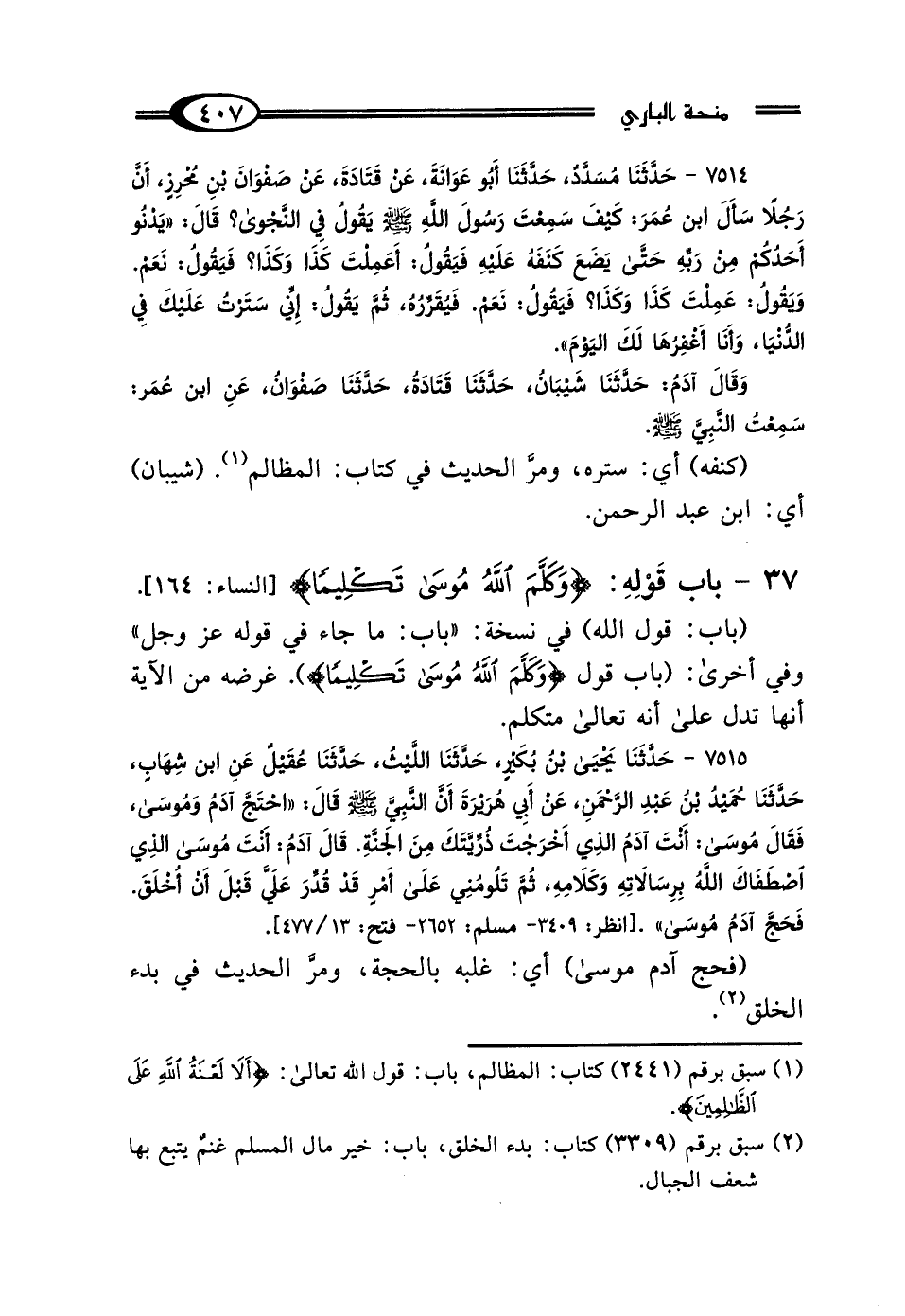 7514 - حَدَّثَنَا مُسَدَّدٌ، حَدَّثَنَا أَبُو عَوَانَةَ، عَنْ قَتَادَةَ، عَنْ صَفْوَانَ بْنِ مُحْرِزٍ، أَنَّ رَجُلًا سَأَلَ ابْنَ عُمَرَ، كَيْفَ سَمِعْتَ رَسُولَ اللَّهِ صَلَّى اللهُ عَلَيْهِ وَسَلَّمَ يَقُولُ فِي النَّجْوَى؟ قَال: "يَدْنُو أَحَدُكُمْ مِنْ رَبِّهِ حَتَّى يَضَعَ كَنَفَهُ عَلَيْهِ، فَيَقُولُ: أَعَمِلْتَ كَذَا وَكَذَا؟ فَيَقُولُ: نَعَمْ، وَيَقُولُ: عَمِلْتَ كَذَا وَكَذَا؟ فَيَقُولُ: نَعَمْ، فَيُقَرِّرُهُ، ثُمَّ يَقُولُ: إِنِّي سَتَرْتُ عَلَيْكَ فِي الدُّنْيَا، وَأَنَا أَغْفِرُهَا لَكَ اليَوْمَ " وَقَال آدَمُ، حَدَّثَنَا شَيْبَانُ، حَدَّثَنَا قَتَادَةُ، حَدَّثَنَا صَفْوَانُ، عَنْ ابْنِ عُمَرَ، سَمِعْتُ النَّبِيَّ صَلَّى اللهُ عَلَيْهِ وَسَلَّمَ.