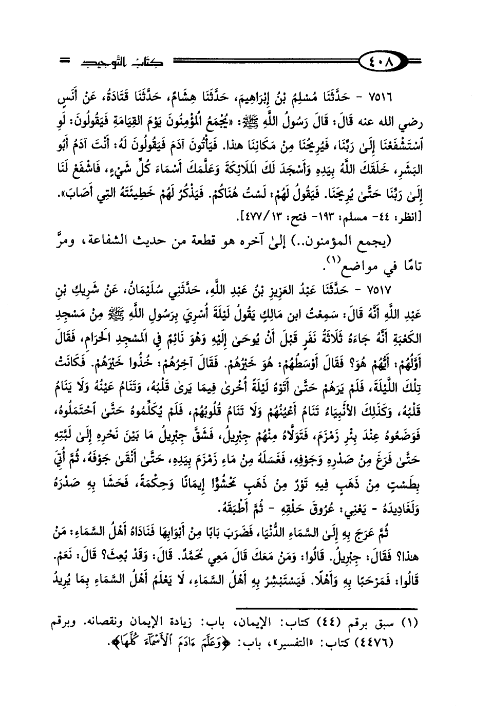 7516 - حَدَّثَنَا مُسْلِمُ بْنُ إِبْرَاهِيمَ، حَدَّثَنَا هِشَامٌ، حَدَّثَنَا قَتَادَةُ، عَنْ أَنَسٍ رَضِيَ اللَّهُ عَنْهُ، قَال: قَال رَسُولُ اللَّهِ صَلَّى اللهُ عَلَيْهِ وَسَلَّمَ: "يُجْمَعُ المُؤْمِنُونَ يَوْمَ القِيَامَةِ فَيَقُولُونَ: لَو اسْتَشْفَعْنَا إِلَى رَبِّنَا فَيُرِيحُنَا مِنْ مَكَانِنَا هَذَا، فَيَأْتُونَ آدَمَ فَيَقُولُونَ لَهُ: أَنْتَ آدَمُ أَبُو البَشَرِ، خَلَقَكَ اللَّهُ بِيَدِهِ، وَأَسْجَدَ لَكَ المَلائِكَةَ، وَعَلَّمَكَ أَسْمَاءَ كُلِّ شَيْءٍ فَاشْفَعْ لَنَا إِلَى رَبِّنَا حَتَّى يُرِيحَنَا، فَيَقُولُ لَهُمْ: لَسْتُ هُنَاكُمْ فَيَذْكُرُ لَهُمْ خَطِيئَتَهُ الَّتِي أَصَابَ".