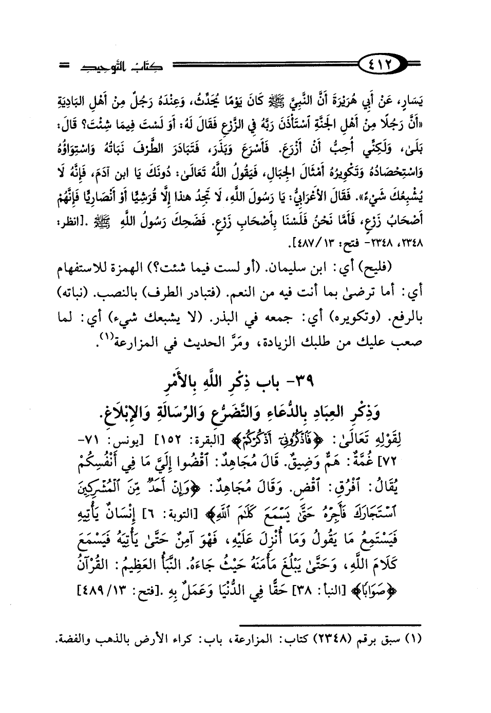 يَسَارٍ، عَنْ أَبِي هُرَيْرَةَ: أَنَّ النَّبِيَّ صَلَّى اللهُ عَلَيْهِ وَسَلَّمَ كَانَ يَوْمًا يُحَدِّثُ وَعِنْدَهُ رَجُلٌ مِنْ أَهْلِ البَادِيَةِ: "أَنَّ رَجُلًا مِنْ أَهْلِ الجَنَّةِ اسْتَأْذَنَ رَبَّهُ فِي الزَّرْعِ، فَقَال لَهُ: أَوَلَسْتَ فِيمَا شِئْتَ؟ قَال: بَلَى، وَلَكِنِّي أُحِبُّ أَنْ أَزْرَعَ، فَأَسْرَعَ وَبَذَرَ، فَتَبَادَرَ الطَّرْفَ نَبَاتُهُ وَاسْتِوَاؤُهُ وَاسْتِحْصَادُهُ وَتَكْويرُهُ أَمْثَال الجِبَالِ، فَيَقُولُ اللَّهُ تَعَالى: دُونَكَ يَا ابْنَ آدَمَ، فَإِنَّهُ لَا يُشْبِعُكَ شَيْءٌ"، فَقَال الأَعْرَابِيُّ: يَا رَسُولَ اللَّهِ، لَا تَجِدُ هَذَا إلا قُرَشِيًّا أَوْ أَنْصَارِيًّا، فَإِنَّهُمْ أَصْحَابُ زَرْعٍ، فَأَمَّا نَحْنُ فَلَسْنَا بِأَصْحَابِ زَرْعٍ، فَضَحِكَ رَسُولُ اللَّهِ.