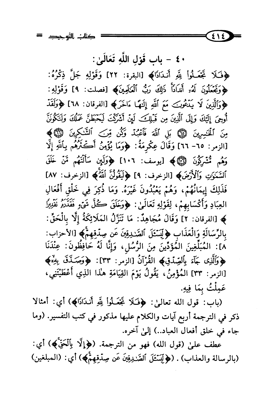 وَقَوْلِهِ جَلَّ ذِكْرُهُ: {وَتَجْعَلُونَ لَهُ أَنْدَادًا ذَلِكَ رَبُّ العَالمِينَ} [فصلت: 9]، وَقَوْلِهِ: {وَالَّذِينَ لَا يَدْعُونَ مَعَ اللَّهِ إِلَهًا آخَرَ} [الفرقان: 68]، {وَلَقَدْ أُوحِيَ إِلَيْكَ وَإِلَى الَّذِينَ مِنْ قَبْلِكَ لَئِنْ أَشْرَكْتَ لَيَحْبَطَنَّ عَمَلُكَ وَلَتَكُونَنَّ مِنَ الخَاسِرِينَ، بَلِ اللَّهَ فَاعْبُدْ وَكُنْ مِنَ الشَّاكِرِينَ} [الزمر: 66] وَقَال عِكْرِمَةُ: {وَمَا يُؤْمِنُ أَكْثَرُهُمْ بِاللَّهِ إلا وَهُمْ مُشْرِكُونَ} [يوسف: 106]، {وَلَئِنْ سَأَلْتَهُمْ مَنْ خَلَقَهُمْ} [الزخرف: 87]، وَ {مَنْ خَلَقَ السَّمَوَاتِ وَالأَرْضَ لَيَقُولُنَّ اللَّهُ} "فَذَلِكَ إِيمَانُهُمْ، وَهُمْ يَعْبُدُونَ غَيْرَهُ" وَمَا ذُكِرَ فِي خَلْقِ أَفْعَالِ العِبَادِ وَأَكْسَابِهِمْ. لِقَوْلِهِ تَعَالى: {وَخَلَقَ كُلَّ شَيْءٍ فَقَدَّرَهُ تَقْدِيرًا} [الفرقان: 2] وَقَال مُجَاهِدٌ: (مَا تَنَزَّلُ المَلائِكَةُ إلا بِالحَقِّ): "بِالرِّسَالةِ وَالعَذَابِ" {لِيَسْأَلَ الصَّادِقِينَ عَنْ صِدْقِهِمْ} [الأحزاب: 8]: "المُبَلِّغِينَ المُؤَدِّينَ مِنَ الرُّسُلِ"، {وَإِنَّا لَهُ لَحَافِظُونَ} [يوسف: 12]: "عِنْدَنَا"، {وَالَّذِي جَاءَ بِالصِّدْقِ} [الزمر: 33]: "القُرْآنُ" {وَصَدَّقَ بِهِ} [الزمر: 33]: "المُؤْمِنُ يَقُولُ يَوْمَ القِيَامَةِ: هَذَا الَّذِي أَعْطَيْتَنِي عَمِلْتُ بِمَا فِيهِ.