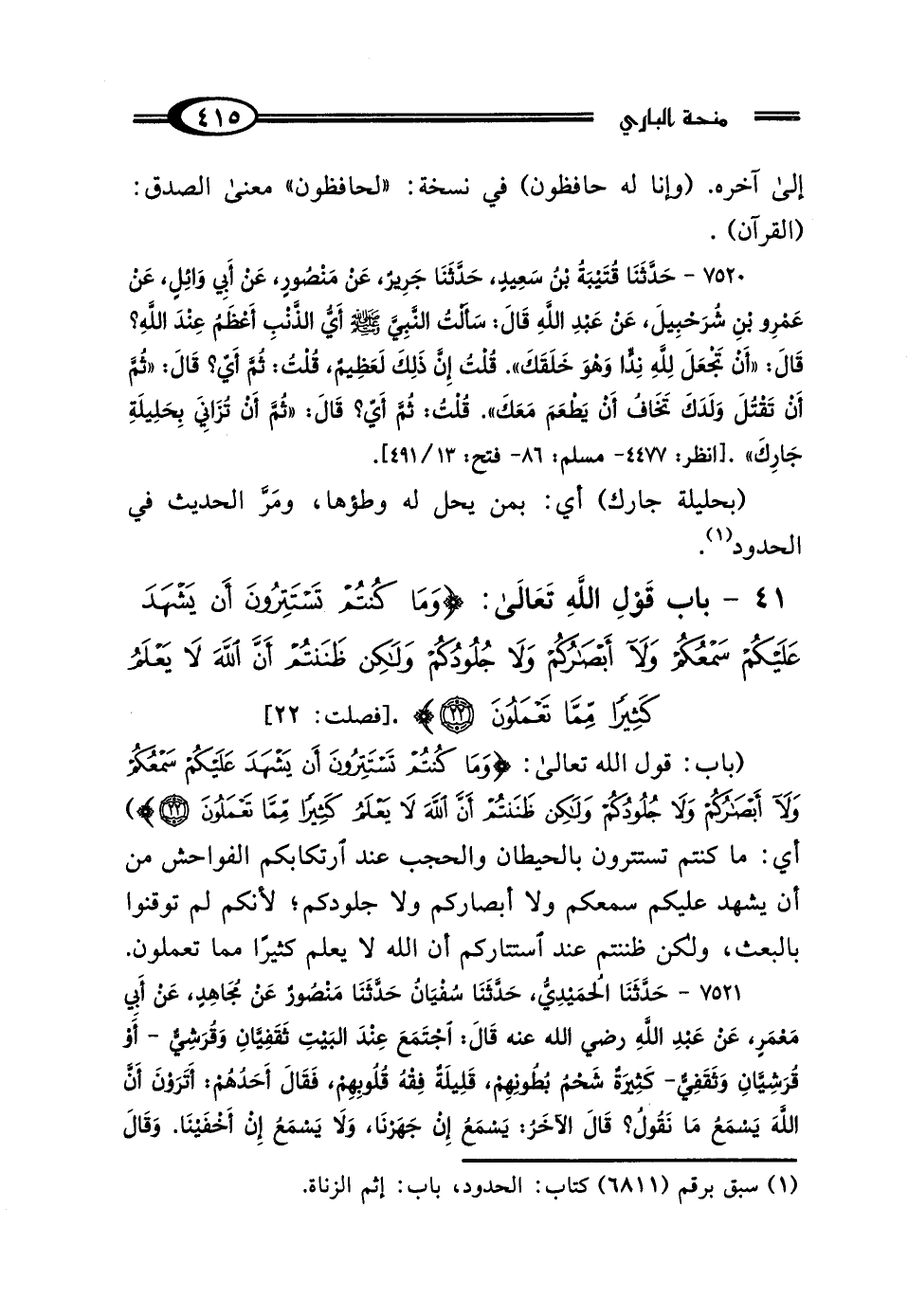 41 - بَابُ قَوْلِ اللَّهِ تَعَالى: {وَمَا كُنْتُمْ تَسْتَتِرُونَ أَنْ يَشْهَدَ عَلَيْكُمْ سَمْعُكُمْ وَلَا أَبْصَارُكُمْ وَلَا جُلُودُكُمْ، وَلَكِنْ ظَنَنْتُمْ أَنَّ اللَّهَ لَا يَعْلَمُ كَثِيرًا مِمَّا تَعْمَلُونَ} [فصلت: 22]