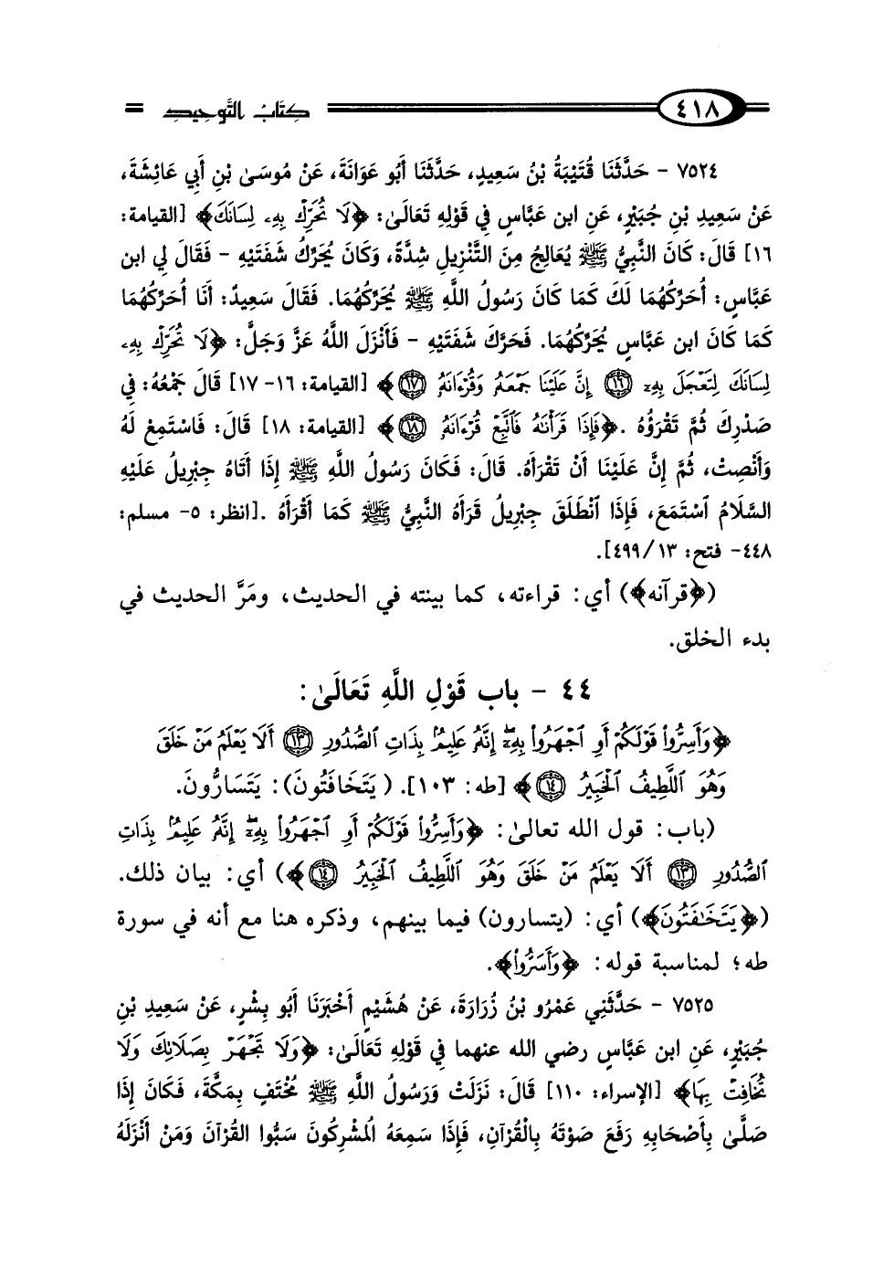 7524 - حَدَّثَنَا قُتَيْبَةُ بْنُ سَعِيدٍ، حَدَّثَنَا أَبُو عَوَانَةَ، عَنْ مُوسَى بْنِ أَبِي عَائِشَةَ، عَنْ سَعِيدِ بْنِ جُبَيْرٍ، عَنِ ابْنِ عَبَّاسٍ فِي قَوْلِهِ تَعَالى: {لَا تُحَرِّكْ بِهِ لِسَانَكَ} [القيامة: 16]، قَال: "كَانَ النَّبِيُّ صَلَّى اللهُ عَلَيْهِ وَسَلَّمَ يُعَالِجُ مِنَ التَّنْزِيلِ شِدَّةً، وَكَانَ يُحَرِّكُ شَفَتَيْهِ" - فَقَال لِي ابْنُ عَبَّاسٍ: فَأَنَا أُحَرِّكُهُمَا لَكَ كَمَا كَانَ رَسُولُ اللَّهِ صَلَّى اللهُ عَلَيْهِ وَسَلَّمَ يُحَرِّكُهُمَا، فَقَال سَعِيدٌ: أَنَا أُحَرِّكُهُمَا كَمَا كَانَ ابْنُ عَبَّاسٍ يُحَرِّكُهُمَا، فَحَرَّكَ شَفَتَيْهِ - فَأَنْزَلَ اللَّهُ عَزَّ وَجَلَّ: {لَا تُحَرِّكْ بِهِ لِسَانَكَ لِتَعْجَلَ بِهِ إِنَّ عَلَيْنَا جَمْعَهُ وَقُرْآنَهُ} [القيامة: 17]، قَال: "جَمْعُهُ فِي صَدْرِكَ ثُمَّ تَقْرَؤُهُ"، {فَإِذَا قَرَأْنَاهُ فَاتَّبِعْ قُرْآنَهُ} [القيامة: 18] قَال: "فَاسْتَمِعْ لَهُ وَأَنْصِتْ، ثُمَّ إِنَّ عَلَيْنَا أَنْ تَقْرَأَهُ، قَال: فَكَانَ رَسُولُ اللَّهِ صَلَّى اللهُ عَلَيْهِ وَسَلَّمَ إِذَا أَتَاهُ جِبْرِيلُ عَلَيْهِ السَّلامُ اسْتَمَعَ، فَإِذَا انْطَلَقَ جِبْرِيلُ قَرَأَهُ النَّبِيُّ صَلَّى اللهُ عَلَيْهِ وَسَلَّمَ كَمَا أَقْرَأَهُ".