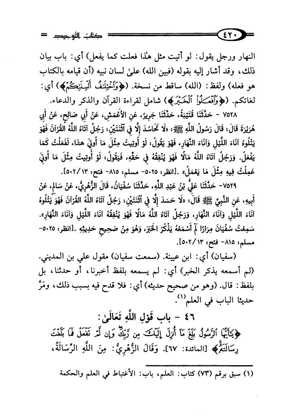 (¬1) سبق برقم (73) كتاب: العلم، باب: الاغتباط في العلم والحكمة.