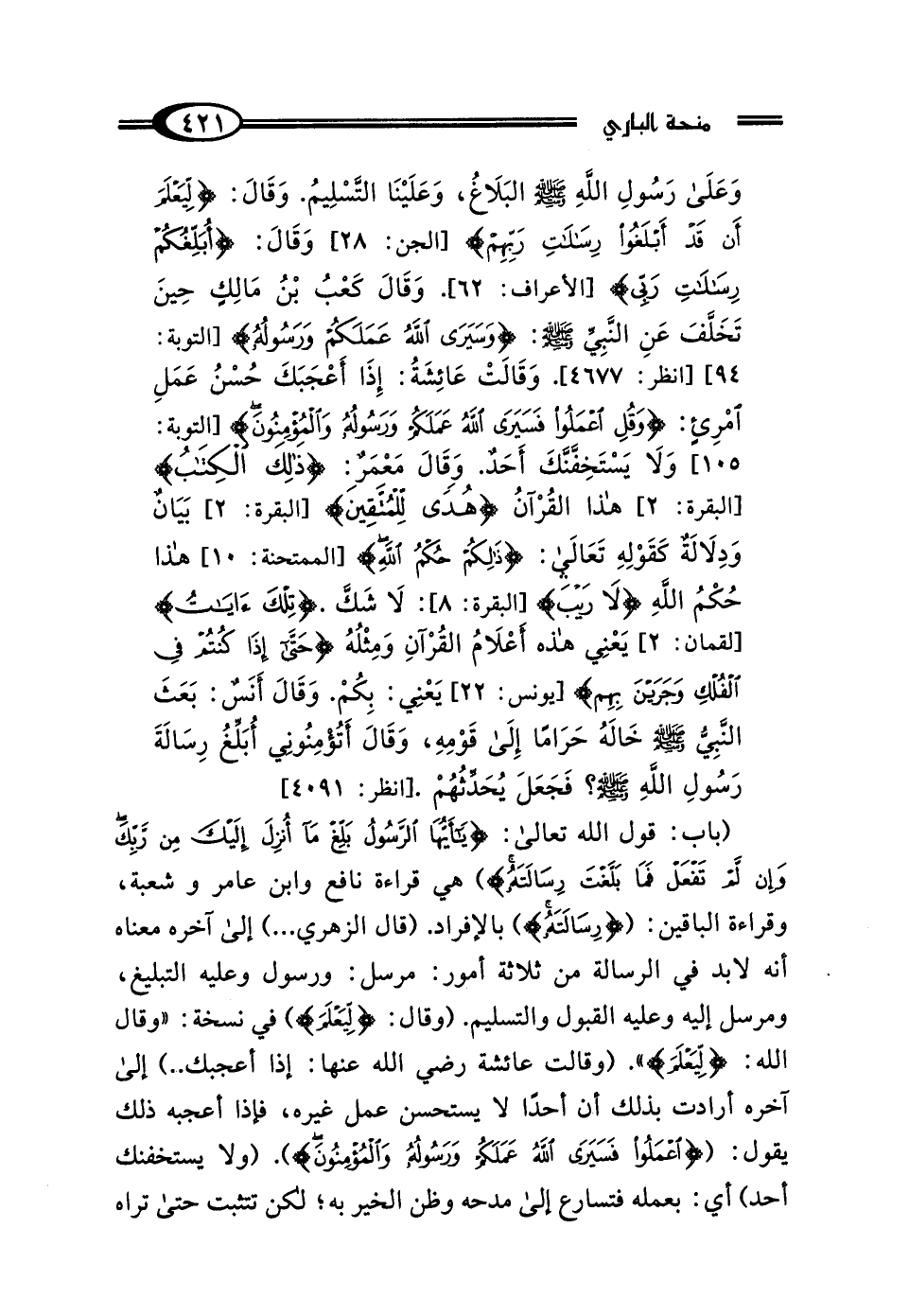 وَعَلَى رَسُولِ اللَّهِ صَلَّى اللهُ عَلَيْهِ وَسَلَّمَ البَلاغُ، وَعَلَيْنَا التَّسْلِيمُ" وَقَال اللَّهُ تَعَالى: {لِيَعْلَمَ أَنْ قَدْ أَبْلَغُوا رِسَالاتِ رَبِّهِمْ} [الجن: 28]، وَقَال تَعَالى: (أُبْلِغُكُمْ رِسَالاتِ رَبِّي) وَقَال كَعْبُ بْنُ مَالِكٍ: "حِينَ تَخَلَّفَ عَنِ النَّبِيِّ صَلَّى اللهُ عَلَيْهِ وَسَلَّمَ: {فَسَيَرَى اللَّهُ عَمَلَكُمْ وَرَسُولُهُ وَالمُؤْمِنُونَ} [التوبة: 105] وَقَالتْ عَائِشَةُ: "إِذَا أَعْجَبَكَ حُسْنُ عَمَلِ امْرِئٍ فَقُلْ: {اعْمَلُوا فَسَيَرَى اللَّهُ عَمَلَكُمْ وَرَسُولُهُ وَالمُؤْمِنُونَ} [التوبة: 105]: وَلَا يَسْتَخِفَّنَّكَ أَحَدٌ " وَقَال مَعْمَرٌ: {ذَلِكَ الكِتَابُ} [البقرة: 2] "هَذَا القُرْآنُ" {هُدًى لِلْمُتَّقِينَ} [البقرة: 2]: "بَيَانٌ وَدِلالةٌ"، كَقَوْلِهِ تَعَالى: {ذَلِكُمْ حُكْمُ اللَّهِ} [الممتحنة: 10]: "هَذَا حُكْمُ اللَّهِ" {لَا رَيْبَ} [البقرة: 2]: "لَا شَكَّ"، {تِلْكَ آيَاتُ} [البقرة: 252]: يَعْنِي هَذِهِ أَعْلامُ القُرْآنِ، وَمِثْلُهُ: {حَتَّى إِذَا كُنْتُمْ فِي الفُلْكِ وَجَرَيْنَ بِهِمْ} [يونس: 22]: "يَعْنِي بِكُمْ" وَقَال أَنَسٌ: بَعَثَ النَّبِيُّ صَلَّى اللهُ عَلَيْهِ وَسَلَّمَ خَالهُ حَرَامًا إِلَى قَوْمِهِ، وَقَال: أَتُؤْمِنُونِي أُبَلِّغُ رِسَالةَ رَسُولِ اللَّهِ صَلَّى اللهُ عَلَيْهِ وَسَلَّمَ؟ فَجَعَلَ يُحَدِّثُهُمْ.
