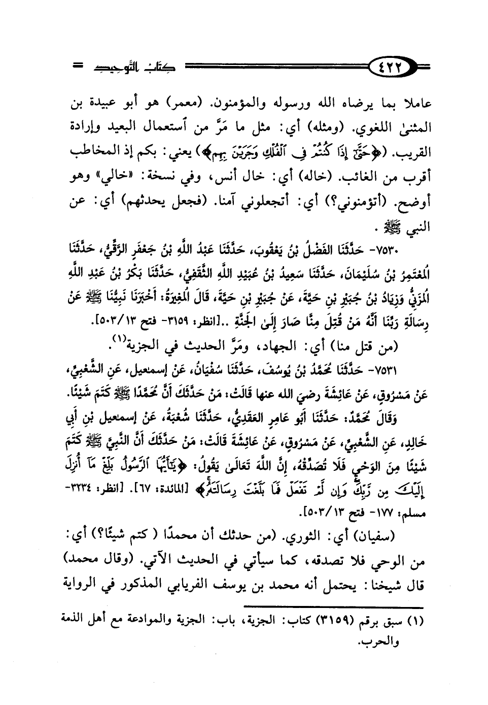 7531 - حَدَّثَنَا مُحَمَّدُ بْنُ يُوسُفَ، حَدَّثَنَا سُفْيَانُ، عَنْ إِسْمَاعِيلَ، عَنِ الشَّعْبِيِّ، عَنْ مَسْرُوقٍ، عَنْ عَائِشَةَ رَضِيَ اللَّهُ عَنْهَا، قَالتْ: مَنْ حَدَّثَكَ أَنَّ مُحَمَّدًا صَلَّى اللهُ عَلَيْهِ وَسَلَّمَ كَتَمَ شَيْئًا؟ وَقَال مُحَمَّدٌ، حَدَّثَنَا أَبُو عَامِرٍ العَقَدِيُّ، حَدَّثَنَا شُعْبَةُ، عَنْ إِسْمَاعِيلَ بْنِ أَبِي خَالِدٍ، عَنِ الشَّعْبِيِّ، عَنْ مَسْرُوقٍ، عَنْ عَائِشَةَ، قَالتْ: "مَنْ حَدَّثَكَ أَنَّ النَّبِيَّ صَلَّى اللهُ عَلَيْهِ وَسَلَّمَ كَتَمَ شَيْئًا مِنَ الوَحْيِ فَلَا تُصَدِّقْهُ، إِنَّ اللَّهَ تَعَالى يَقُولُ": {يَا أَيُّهَا الرَّسُولُ بَلِّغْ مَا أُنْزِلَ إِلَيْكَ مِنْ رَبِّكَ وَإِنْ لَمْ تَفْعَلْ فَمَا بَلَّغْتَ رِسَالتَهُ} [المائدة: 67].