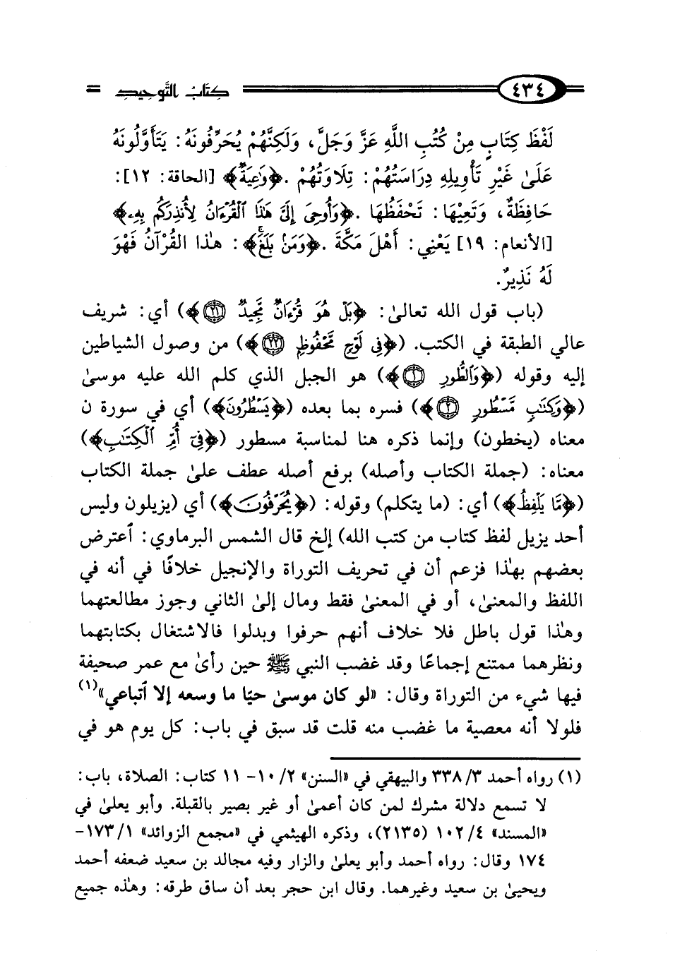 (باب قول الله تعالى: {بَلْ هُوَ قُرْآنٌ مَجِيدٌ (21)}) أي: شريف عالي الطبقة في الكتب. ({فِي لَوْحٍ مَحْفُوظٍ}) من وصول الشياطين إليه وقوله ({وَالطُّورِ (1)}) هو الجبل الذي كلم الله عليه موسى ({وَكِتَابٍ مَسْطُورٍ}) فسره بما بعده ({يَسْطُرُونَ}) أي في سورة ن معناه (يخطون) وإنما ذكره هنا لمناسبة مسطور ({فِي أُمِّ الْكِتَابِ}) معناه: (جملة الكتاب وأصله) برفع أصله عطف على جملة الكتاب ({مَا يَلْفِظُ}) أي: (ما يتكلم) وقوله: ({يُحَرِّفُونَ}) أي (يزيلون وليس أحد يزيل لفظ كتاب من كتب الله) إلخ قال الشمس البرماوي: اعترض بعضهم بهذا فزعم أن في تحريف التوراة والإنجيل خلافًا في أنه في اللفظ والمعنى، أو في المعني فقط ومال إلى الثاني وجوز مطالعتهما وهذا قول باطل فلا خلاف أنهم حرفوا وبدلوا فالاشتغال بكتابتهما ونظرهما ممتنع إجماعًا وقد غضب النبي - صلى الله عليه وسلم - حين رأى مع عمر صحيفة فيها شيء من التوراة وقال: "لو كان موسى حيًّا ما وسعه إلا اتباعي" (¬1) فلولا أنه معصية ما غضب منه قلت قد سبق في باب: كل يوم هو في