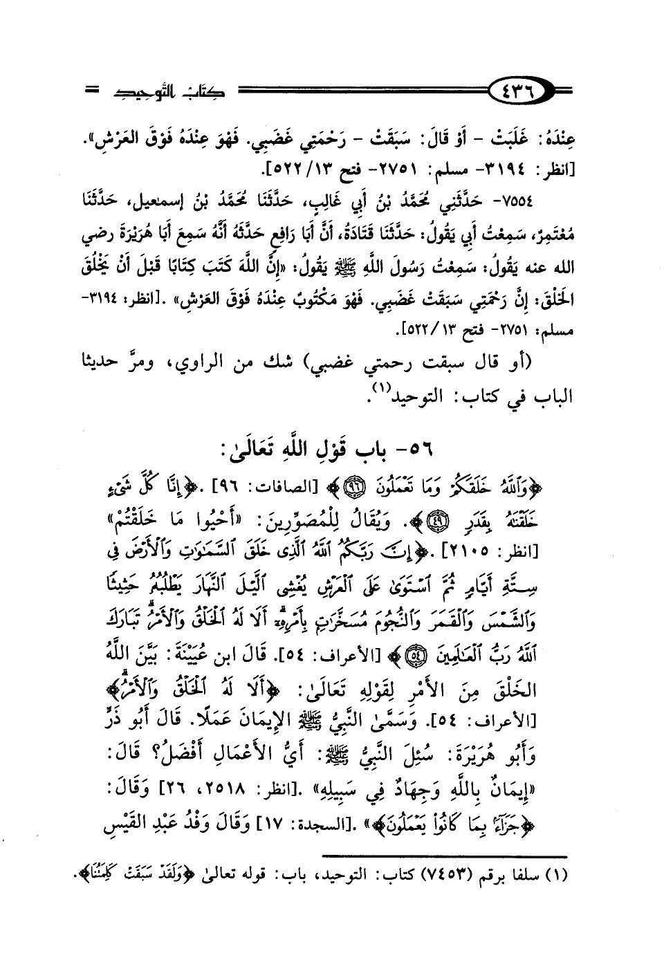 {إِنَّا كُلَّ شَيْءٍ خَلَقْنَاهُ بِقَدَرٍ} [القمر: 49] وَيُقَالُ لِلْمُصَوِّرِينَ: "أَحْيُوا مَا خَلَقْتُمْ" {إِنَّ رَبَّكُمُ اللَّهُ الَّذِي خَلَقَ السَّمَوَاتِ وَالأَرْضَ فِي سِتَّةِ أَيَّامٍ، ثُمَّ اسْتَوَى عَلَى العَرْشِ يُغْشِي اللَّيْلَ النَّهَارَ، يَطْلُبُهُ حَثِيثًا وَالشَّمْسَ وَالقَمَرَ وَالنُّجُومَ مُسَخَّرَاتٍ بِأَمْرِهِ، أَلا لَهُ الخَلْقُ وَالأَمْرُ تَبَارَكَ اللَّهُ رَبُّ العَالمِينَ} قَال ابْنُ عُيَيْنَةَ: "بَيَّنَ اللَّهُ الخَلْقَ مِنَ الأَمْرِ، لِقَوْلِهِ تَعَالى": {أَلا لَهُ الخَلْقُ وَالأَمْرُ} [الأعراف: 54] وَسَمَّى النَّبِيُّ صَلَّى اللهُ عَلَيْهِ وَسَلَّمَ الإِيمَانَ عَمَلًا قَال أَبُو ذَرٍّ، وَأَبُو هُرَيْرَةَ: سُئِلَ النَّبِيُّ صَلَّى اللهُ عَلَيْهِ وَسَلَّمَ أَيُّ الأَعْمَالِ أَفْضَلُ؟ قَال: "إِيمَانٌ بِاللَّهِ وَجِهَادٌ فِي سَبِيلِهِ" وَقَال: {جَزَاءً بِمَا كَانُوا يَعْمَلُونَ} [السجدة: 17] وَقَال وَفْدُ عَبْدِ القَيْسِ