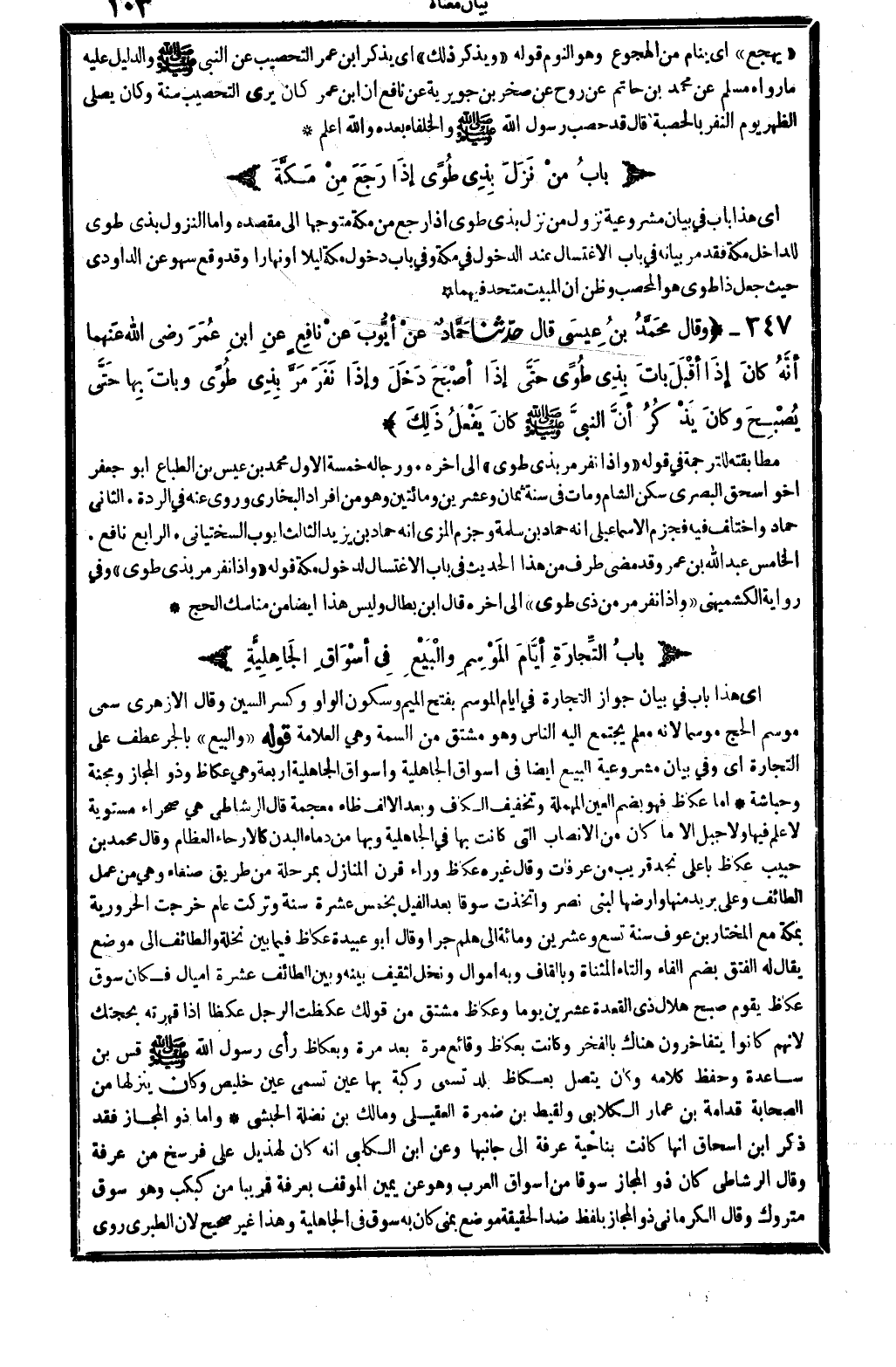 9671 - وقالَ محَمَّدُ بنُ عِيسَى قَالَ حدَّثنا حَمَّادٌ عنْ أيُّوبَ عنْ نَافِعٍ عنِ ابنِ عُمَرَ رَضِي الله تَعَالَى عَنْهُمَا أنَّهُ كانَ إذَا أقْبَلَ باتَ بِذِي طُوىً حَتَّى إذَا أصْبَحَ دَخَلَ وإذَا نَفَرَ مَرَّ بِذِي طُوَىً وباتَ بِها حَتَّى يُصْبِحَ وكانَ يَذْكُرُ أنَّ النَّبِيَّ صلى الله عَلَيْهِ وَسلم كانَ يَفْعَلُ ذَلِكَ.