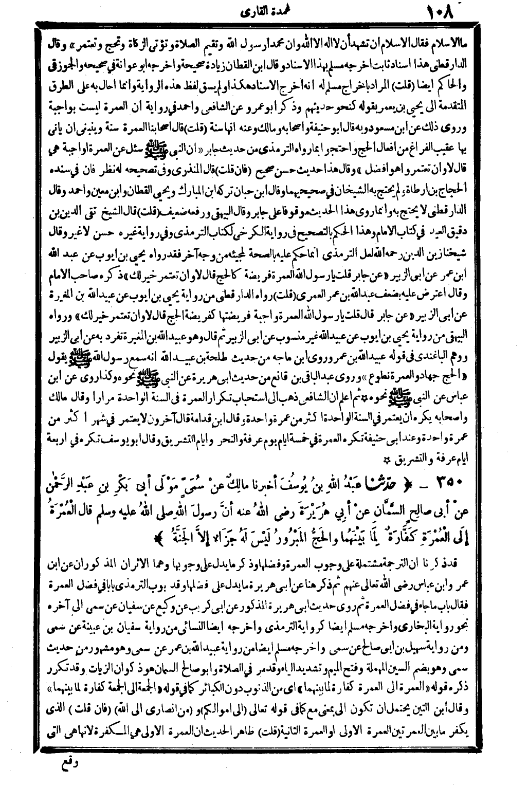مَا الأسلام؟ فَقَالَ) الْإِسْلَام أَن تشهد أَن لَا إلاهَ إلاَّ الله وَأَن مُحَمَّدًا رَسُول الله، وتقيم الصَّلَاة وتؤتي الزَّكَاة وتحج وتعتمر) . وَقَالَ الدَّارَقُطْنِيّ: هَذَا إِسْنَاد ثَابت أخرجه مُسلم بِهَذَا الْإِسْنَاد، وَقَالَ ابْن الْقطَّان: زِيَادَة صَحِيحَة، وَأخرجه أَبُو عوَانَة فِي (صَحِيحه) والجوزقي وَالْحَاكِم أَيْضا قلت: المُرَاد بِإِخْرَاج مُسلم لَهُ أَنه أخرج الْإِسْنَاد هَكَذَا، وَلم يسق لفظ هَذِه الرِّوَايَة، وَإِنَّمَا أحَال بِهِ على الطّرق الْمُتَقَدّمَة إِلَى يحيى بن يعمر بقوله كنحو حَدِيثهمْ، وَذكر أَبُو عَمْرو عَن الشَّافِعِي وَأحمد فِي رِوَايَة: أَن الْعمرَة لَيست بواجبة وروى ذَلِك عَن ابْن مَسْعُود، وَبِه قَالَ أَبُو حنيفَة وَأَصْحَابه وَمَالك وَعنهُ أَنَّهَا سنة. قلت: قَالَ أَصْحَابنَا: الْعمرَة سنة وَيَنْبَغِي أَن يَأْتِي بهَا عقيب الْفَرَاغ من أَفعَال الْحَج، وَاحْتَجُّوا بِمَا رَوَاهُ التِّرْمِذِيّ من حَدِيث جَابر (أَن النَّبِي صلى الله عَلَيْهِ وَسلم سُئِلَ عَن الْعمرَة أَوَاجِبَة هِيَ قَالَ: لَا، وَإِن تَعْتَمِرُوا هُوَ أفضل) . وَقَالَ: هَذَا حَدِيث حسن صَحِيح. فَإِن قلت: قَالَ الْمُنْذِرِيّ: وَفِي تَصْحِيحه لَهُ نظر، فَإِن فِي سَنَده الْحجَّاج بن أَرْطَاة وَلم يحْتَج بِهِ الشَّيْخَانِ فِي (صَحِيحَيْهِمَا) . وَقَالَ ابْن حبَان: تَركه ابْن الْمُبَارك وَيحيى الْقطَّان وَابْن معِين وَأحمد، وَقَالَ الدَّارَقُطْنِيّ: لَا يحْتَج بِهِ، وَإِنَّمَا روى هَذَا الحَدِيث مَوْقُوفا على جَابر، وَقَالَ الْبَيْهَقِيّ: وَرَفعه ضَعِيف. قلت: قَالَ الشَّيْخ تَقِيّ الدّين بن دَقِيق الْعِيد فِي كتاب (الإِمَام) : وَهَذَا الحكم بالتصحيح فِي رِوَايَة الْكَرْخِي لكتاب التِّرْمِذِيّ، وَفِي رِوَايَة غَيره: حسن لَا غير، وَقَالَ شَيخنَا زين الدّين، رَحمَه الله: لَعَلَّ التِّرْمِذِيّ إِنَّمَا حكم عَلَيْهِ بِالصِّحَّةِ لمجيئه من وَجه آخر، فقد رَوَاهُ يحيى بن أَيُّوب عَن عبد الله ابْن عمر عَن أبي الزبير، (عَن جَابر، قلت: يَا رَسُول الله {الْعمرَة فَرِيضَة كَالْحَجِّ؟ قَالَ: لَا، وَإِن تعتمر خير لَك) . ذكره صَاحب (الإِمَام) ، وَقَالَ: اعْترض عَلَيْهِ بِضعْف عبد الله بن عمر الْعمريّ. قلت: رَوَاهُ الدَّارَقُطْنِيّ من رِوَايَة يحيى بن أَيُّوب عَن عبيد الله بن الْمُغيرَة عَن أبي الزبير (عَن جَابر، قَالَ: قلت: يَا رَسُول الله} الْعمرَة وَاجِبَة فريضتها كفريضة الْحَج؟ قَالَ: لَا، وَإِن تعتمر خير لَك) . وَرَوَاهُ الْبَيْهَقِيّ من رِوَايَة يحيى بن أَيُّوب عَن عبيد الله غير مَنْسُوب عَن أبي الزبير، ثمَّ قَالَ: وَهُوَ عبيد الله بن الْمُغيرَة، تفرد بِهِ عَن أبي الزبير، وَوهم الباغندي فِي قَوْله: عبيد الله بن عمر، وروى ابْن مَاجَه من حَدِيث طَلْحَة بن عبيد الله أَنه سمع رَسُول الله صلى الله عَلَيْهِ وَسلم يَقُول: (الْحَج جِهَاد وَالْعمْرَة تطوع) ، وروى عبد الْبَاقِي بن قَانِع من حَدِيث أبي هُرَيْرَة عَن النَّبِي صلى الله عَلَيْهِ وَسلم نَحوه، وَكَذَا روى عَن ابْن عَبَّاس عَن النَّبِي صلى الله عَلَيْهِ وَسلم نَحوه. ثمَّ إعلم أَن الشَّافِعِي ذهب إِلَى اسْتِحْبَاب تكْرَار الْعمرَة فِي السّنة الْوَاحِدَة مرَارًا، وَقَالَ مَالك وَأَصْحَابه: يكره أَن يعْتَمر فِي السّنة الْوَاحِدَة أَكثر من عمْرَة وَاحِدَة، وَقَالَ ابْن قدامَة: قَالَ آخَرُونَ: لَا يعْتَمر فِي شهر أَكثر من عمْرَة وَاحِدَة، وَعند أبي حنيفَة: تكره الْعمرَة فِي خَمْسَة أَيَّام: يَوْم عَرَفَة، والنحر، وَأَيَّام التَّشْرِيق. وَقَالَ أَبُو يُوسُف: تكره فِي أَرْبَعَة أَيَّام عَرَفَة، والتشريق.