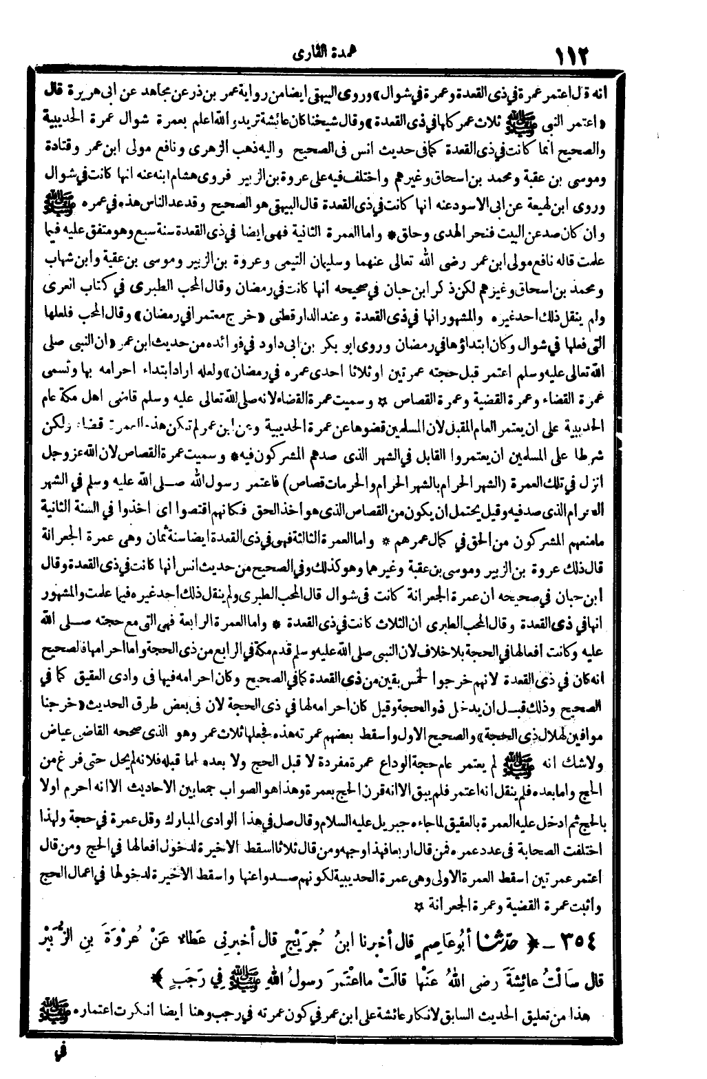 أَنه قَالَ: (اعْتَمر عمْرَة فِي ذِي الْقعدَة وَعمرَة فِي شَوَّال) وروى الْبَيْهَقِيّ أَيْضا من رِوَايَة عمر بن ذَر عَن مُجَاهِد عَن أبي هُرَيْرَة، قَالَ: (اعْتَمر النَّبِي صلى الله عَلَيْهِ وَسلم ثَلَاث عمر كلهَا فِي ذِي الْقعدَة) . وَقَالَ شَيخنَا: كَأَن عَائِشَة تُرِيدُ وَالله أعلم بِعُمْرَة شَوَّال عمْرَة الْحُدَيْبِيَة، وَالصَّحِيح إِنَّمَا كَانَت فِي ذِي الْقعدَة، كَمَا فِي حَدِيث أنس فِي الصَّحِيح، وَإِلَيْهِ ذهب الزُّهْرِيّ وَنَافِع مولى ابْن عمر وَقَتَادَة ومُوسَى بن عقبَة وَمُحَمّد بن إِسْحَاق وَغَيرهم، وَاخْتلف فِيهِ على عُرْوَة بن الزبير، فروى هِشَام ابْنه عَنهُ: أَنَّهَا كَانَت فِي شَوَّال، وروى ابْن لَهِيعَة عَن أبي الْأسود عَنهُ: أَنَّهَا كَانَت فِي ذِي الْقعدَة. قَالَ الْبَيْهَقِيّ: هُوَ الصَّحِيح، وَقد عد النَّاس هَذِه فِي عمْرَة صلى الله عَلَيْهِ وَسلم وَإِن كَانَ صد عَن الْبَيْت فَنحر الْهَدْي وَحلق.