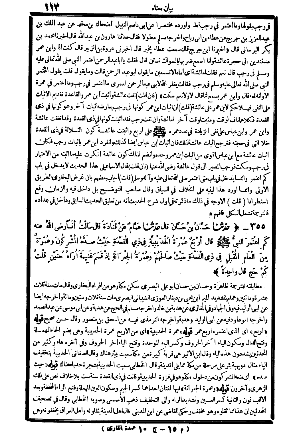 فِي رَجَب بقولِهَا: وَمَا اعْتَمر فِي رَجَب قطّ، وَأوردهُ مُخْتَصرا عَن أبي عَاصِم النَّبِيل الضَّحَّاك، بن مخلد عَن عبد الْملك بن عبد الْعَزِيز بن جريج عَن عَطاء بن أبي رَبَاح. وَأخرجه مُسلم مطولا، فَقَالَ: حَدثنَا هَارُون بن عبد الله، قَالَ: أخبرنَا مُحَمَّد بن بكر البرْسَانِي، قَالَ: (أخبرنَا ابْن جريج، قَالَ: سَمِعت عَطاء يخبر، قَالَ: أَخْبرنِي عُرْوَة بن الزبير، قَالَ: كنت أَنا وَابْن عمر مستندين إِلَى حجرَة عَائِشَة، وَأَنا أسمع ضربهَا بِالسِّوَاكِ تستن، قَالَ: فَقلت: يَا أَبَا عبد الرَّحْمَن {اعْتَمر النَّبِي، صلى الله عَلَيْهِ وَسلم، فِي رَجَب؟ قَالَ: نعم، فَقلت لعَائِشَة: أَي أُمَّاهُ} أَلا تسمعين مَا يَقُول أَبُو عبد الرَّحْمَن؟ قَالَت: وَمَا يَقُول؟ قلت: يَقُول: اعْتَمر النَّبِي، صلى الله عَلَيْهِ وَسلم، فِي رَجَب. فَقَالَت: يغْفر الله لأبي عبد الرَّحْمَن، لعمري مَا اعْتَمر فِي رَجَب، وَمَا اعْتَمر فِي عمْرَة إلاَّ وَأَنه لمعه. قَالَ: وَابْن عمر يسمع، فَمَا قَالَ: لَا وَلَا نعم، سكت) . فَإِن قلت: نفت عَائِشَة وَأثبت ابْن عمر، وَالْقَاعِدَة تَقْدِيم الْإِثْبَات على النَّفْي، فَهَلا حكم لِابْنِ عمر على عَائِشَة؟ قلت: إِن إِثْبَات ابْن عمر كَونهَا فِي رَجَب يُعَارضهُ إِثْبَات آخر، وَهُوَ كَونهَا فِي ذِي الْقعدَة، فكلاهما نافٍ لوقت ومثبت لوقت آخر، فعائشة، وَإِن نفت رَجَب، فقد أَثْبَتَت كَونهَا فِي ذِي الْقعدَة، وَقد اتّفقت عَائِشَة وَابْن عمر وَابْن عَبَّاس على نفي الزِّيَادَة فِي عدد عمره صلى الله عَلَيْهِ وَسلم على أَربع، وأثبتت عَائِشَة كَون الثَّلَاثَة فِي ذِي الْقعدَة خلا الَّتِي فِي حجَّته، فترجح إِثْبَات عَائِشَة لذَلِك، فَإِن إِثْبَات ابْن عَبَّاس أَيْضا كَذَلِك، وَانْفَرَدَ ابْن عمر بِإِثْبَات رَجَب، فَكَانَ إِثْبَات عَائِشَة مَعَ ابْن عَبَّاس أقوى من إِثْبَات ابْن عمر وَحده، وانضم لذَلِك كَون عَائِشَة أنْكرت عَلَيْهِ مَا أثْبته من الاعتمار فِي رَجَب، وَسكت، فَوَجَبَ الْمصير إِلَى قَول عَائِشَة رَضِي الله تَعَالَى عَنْهَا. فَإِن قلت: قَالَ الْإِسْمَاعِيلِيّ: هَذَا الحَدِيث لَا يدْخل فِي: بَاب كم اعْتَمر، وَإِنَّمَا يدْخل فِي: بَاب مَتى اعْتَمر، صلى الله عَلَيْهِ وَسلم؟ قلت: أجَاب بَعضهم بِأَن غَرَض البُخَارِيّ الطَّرِيق الأولى، وَإِنَّمَا أورد هَذَا لينبه على الْخلاف فِي السِّيَاق، وَقَالَ صَاحب (التَّوْضِيح) : بل دَاخل فِيهِ، وَالزَّمَان وَقع اسْتِطْرَادًا. قلت: الْأَوْجه فِي ذَلِك مَا ذكرته فِي أول شرح الحَدِيث أَنه من تَعْلِيق الحَدِيث السَّابِق، وداخل فِي عداده، فالترجمة تَشْمَل الْكل. فَافْهَم.
