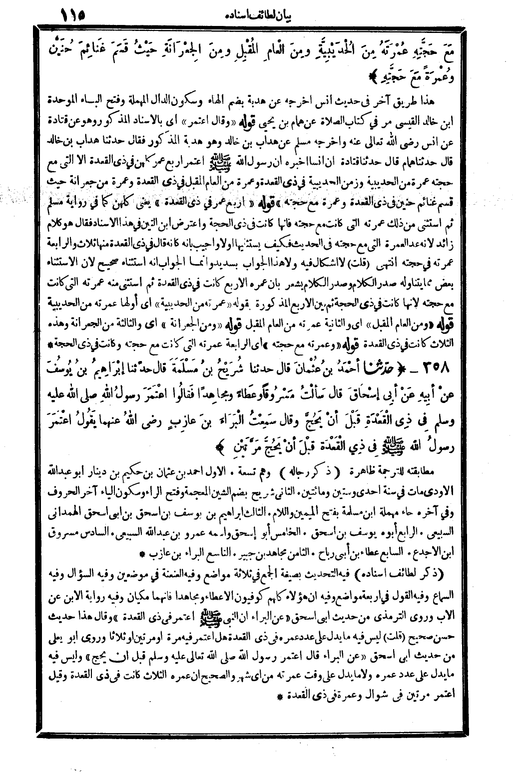 ذكر لطائف إِسْنَاده: فِيهِ: التحديث بِصِيغَة الْجمع فِي ثَلَاثَة مَوَاضِع. وَفِيه: العنعنة فِي موضِعين. وَفِيه: السُّؤَال. وَفِيه: السماع. وَفِيه: القَوْل فِي أَرْبَعَة مَوَاضِع. وَفِيه: أَن هَؤُلَاءِ كلهم كوفيون إلاَّ عَطاء ومجاهدا فَإِنَّهُمَا مكيان. وَفِيه: رِوَايَة الابْن عَن الْأَب وروى التِّرْمِذِيّ من حَدِيث أبي إِسْحَاق (عَن الْبَراء أَن النَّبِي صلى الله عَلَيْهِ وَسلم اعْتَمر فِي ذِي الْقعدَة) . وَقَالَ: هَذَا حَدِيث حسن صَحِيح. قلت: لَيْسَ فِيهِ مَا يدل على عدد عمره فِي ذِي الْقعدَة، هَل اعْتَمر فِيهِ مرّة أَو مرَّتَيْنِ أَو ثَلَاثًا) . وروى أَبُو يعلى من حَدِيث أبي إِسْحَاق (عَن الْبَراء قَالَ: اعْتَمر رَسُول الله، صلى الله عَلَيْهِ وَسلم، قبل أَن يحجّ) ، وَلَيْسَ فِيهِ مَا يدل على عدد عمره، وَلَا مَا يدل على وَقت عمرته من أَي شهر، وَالصَّحِيح أَن عمره الثَّلَاث كَانَت فِي ذِي الْقعدَة، وَقيل: اعْتَمر مرَّتَيْنِ فِي شَوَّال، وَعمرَة فِي ذِي الْقعدَة.